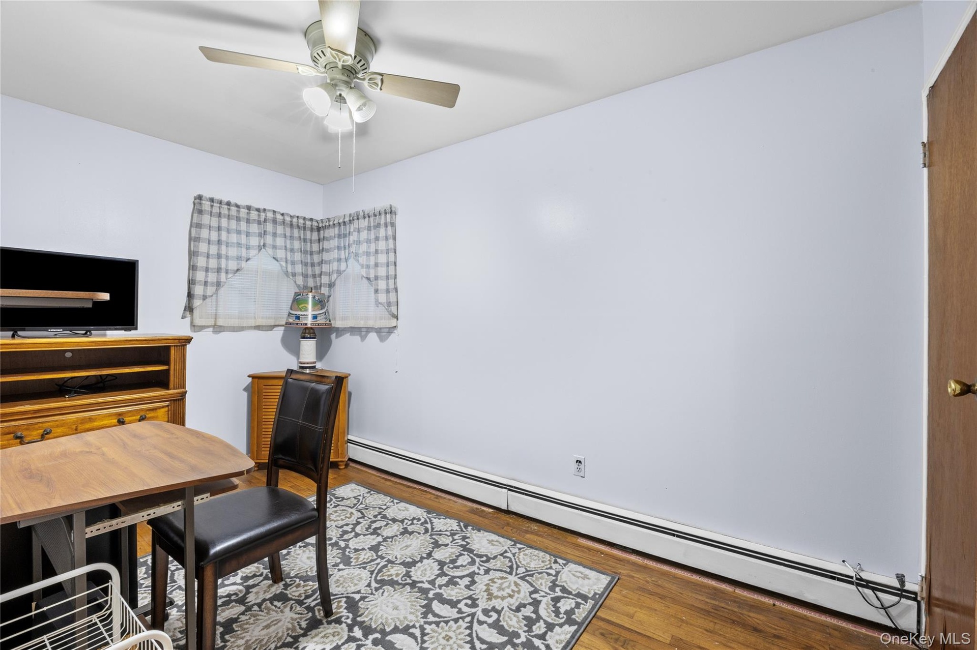 - Office with baseboard heating, wood finished floors, and ceiling fan
