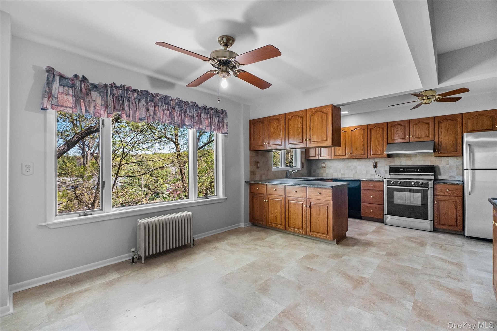 - Kitchen featuring a ceiling fan, brown cabinetry, radiator heating unit, appliances with stainless steel finishes, and a peninsula