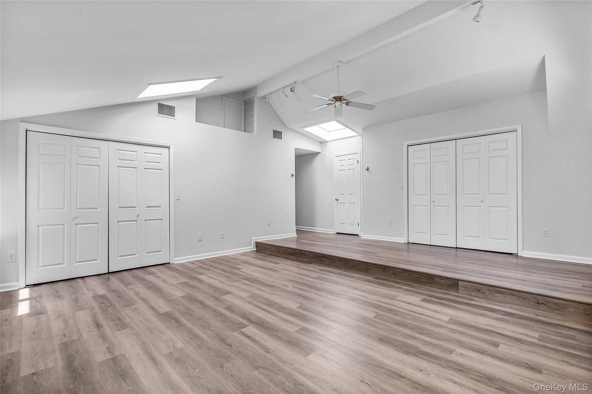 - Unfurnished bedroom with a skylight, two closets, light wood-type flooring, and ceiling fan