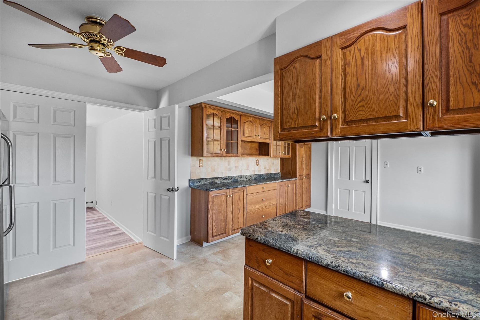 - Kitchen with brown cabinets, a ceiling fan, backsplash, dark stone countertops, and radiator heating unit
