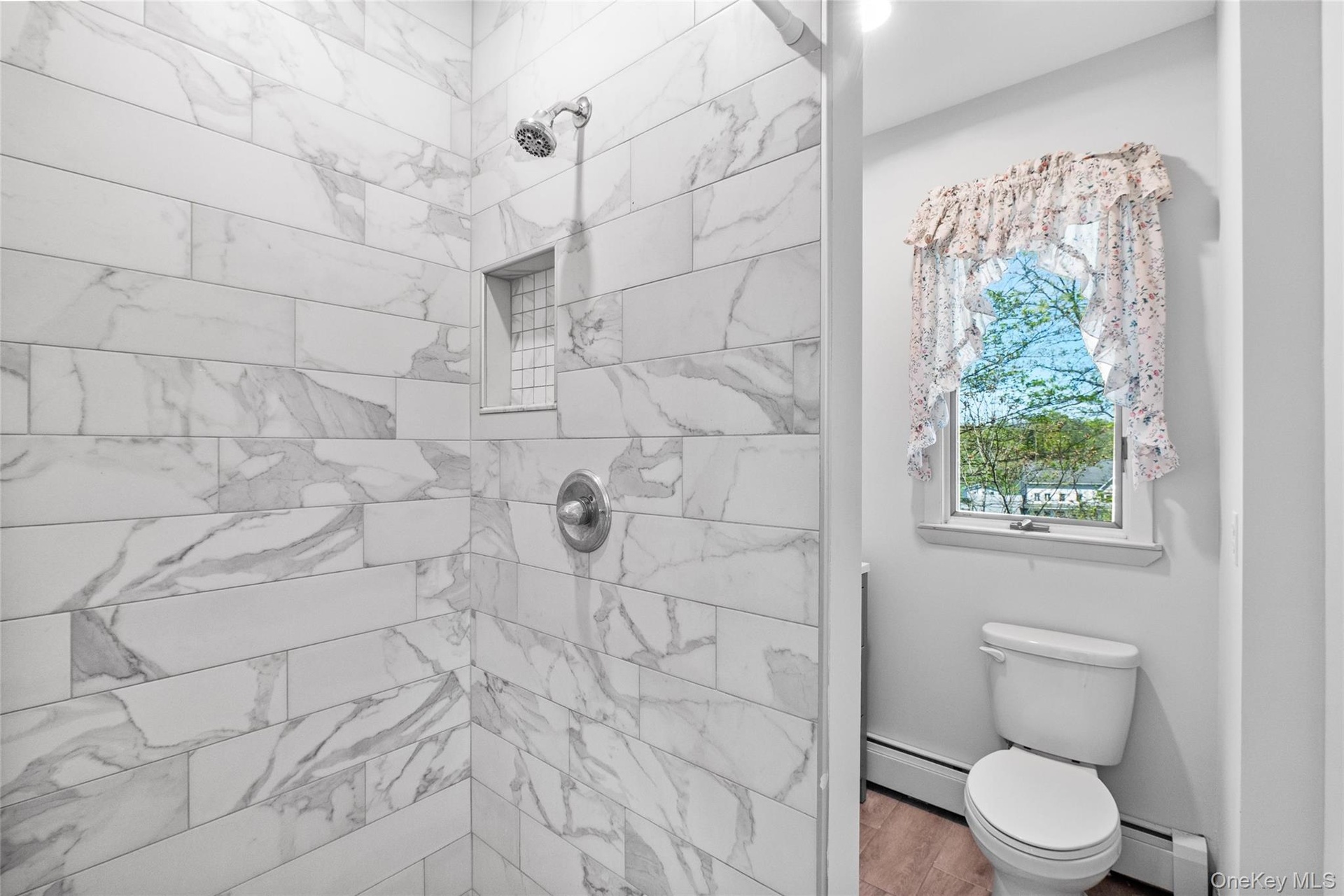 - Bathroom featuring tiled shower, a baseboard radiator, and wood finished floors