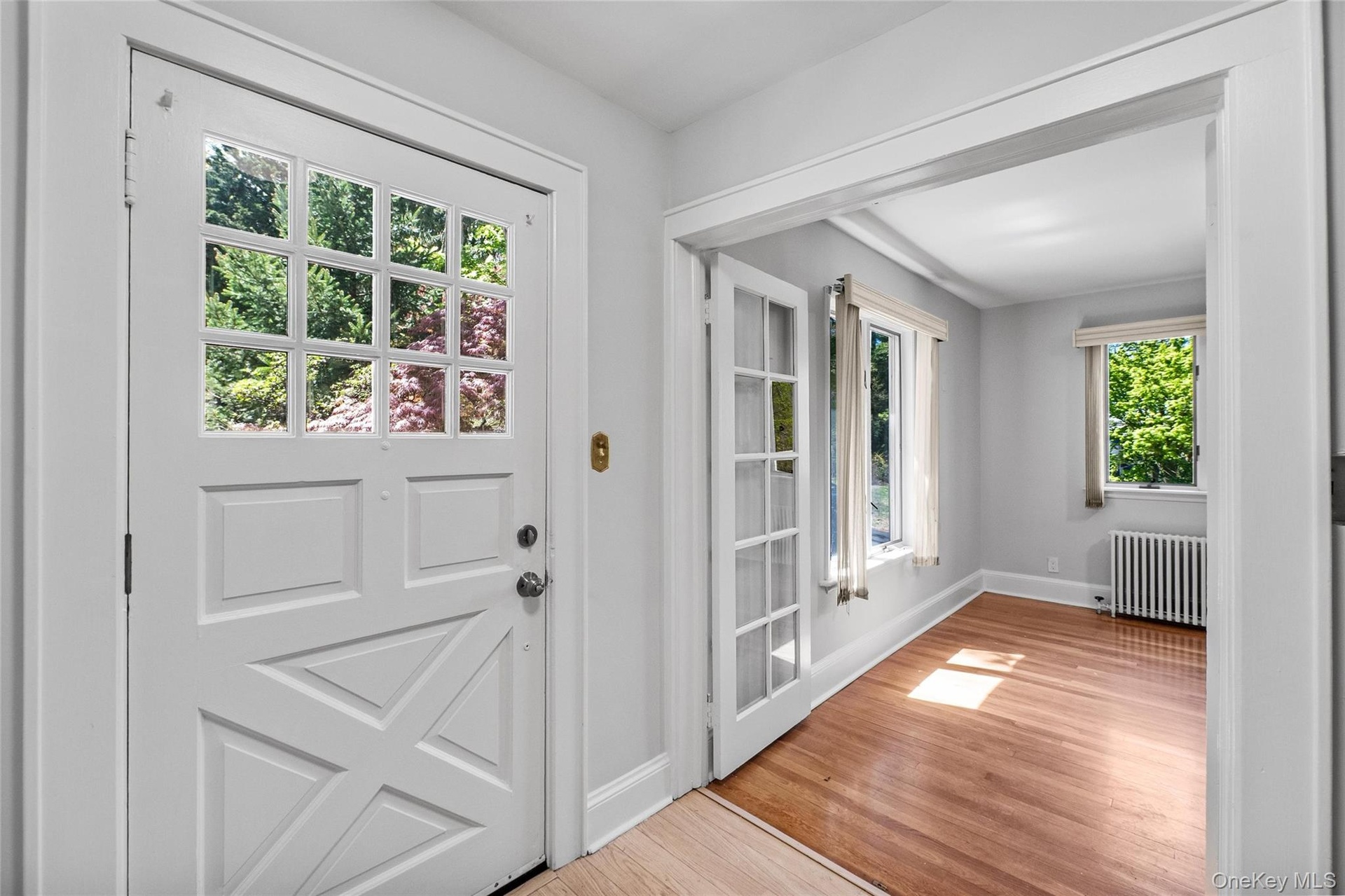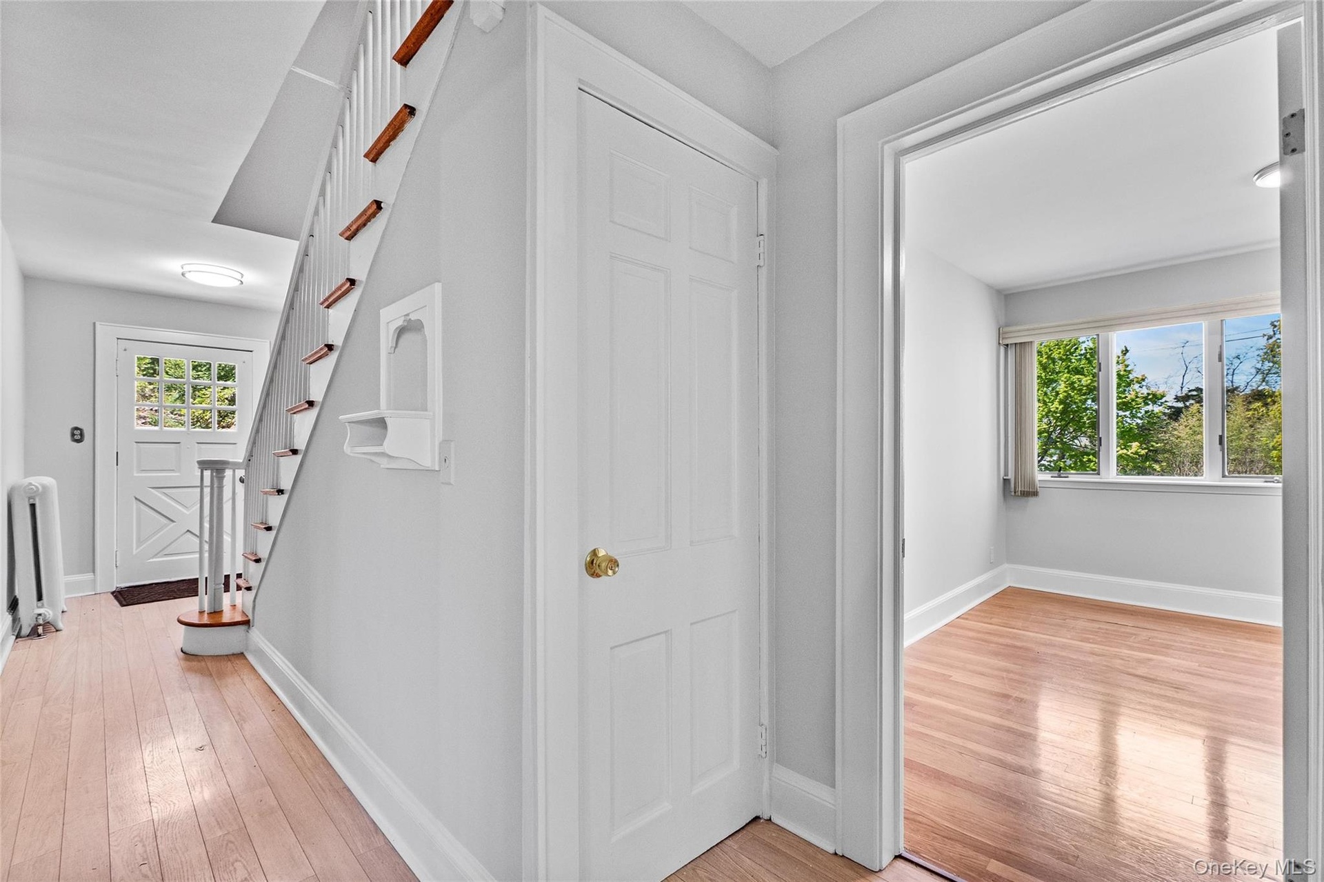 - Hall with stairs, light wood-type flooring, and radiator heating unit