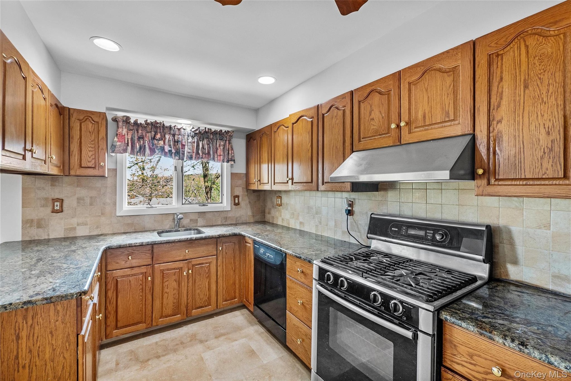 - Kitchen featuring brown cabinetry, gas stove, dark stone counters, under cabinet range hood, and tasteful backsplash
