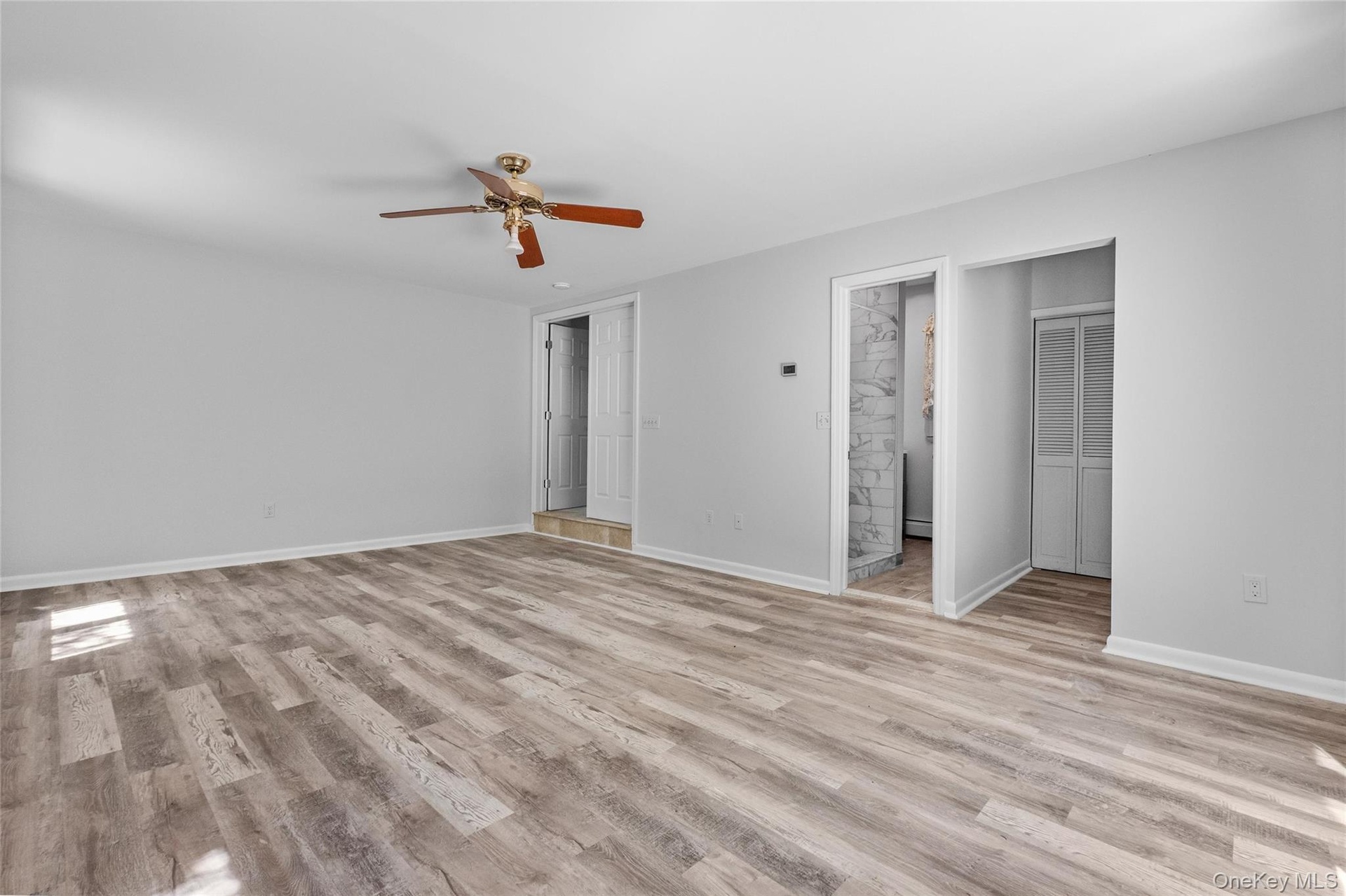 - Unfurnished bedroom with light wood finished floors, a closet, and ceiling fan