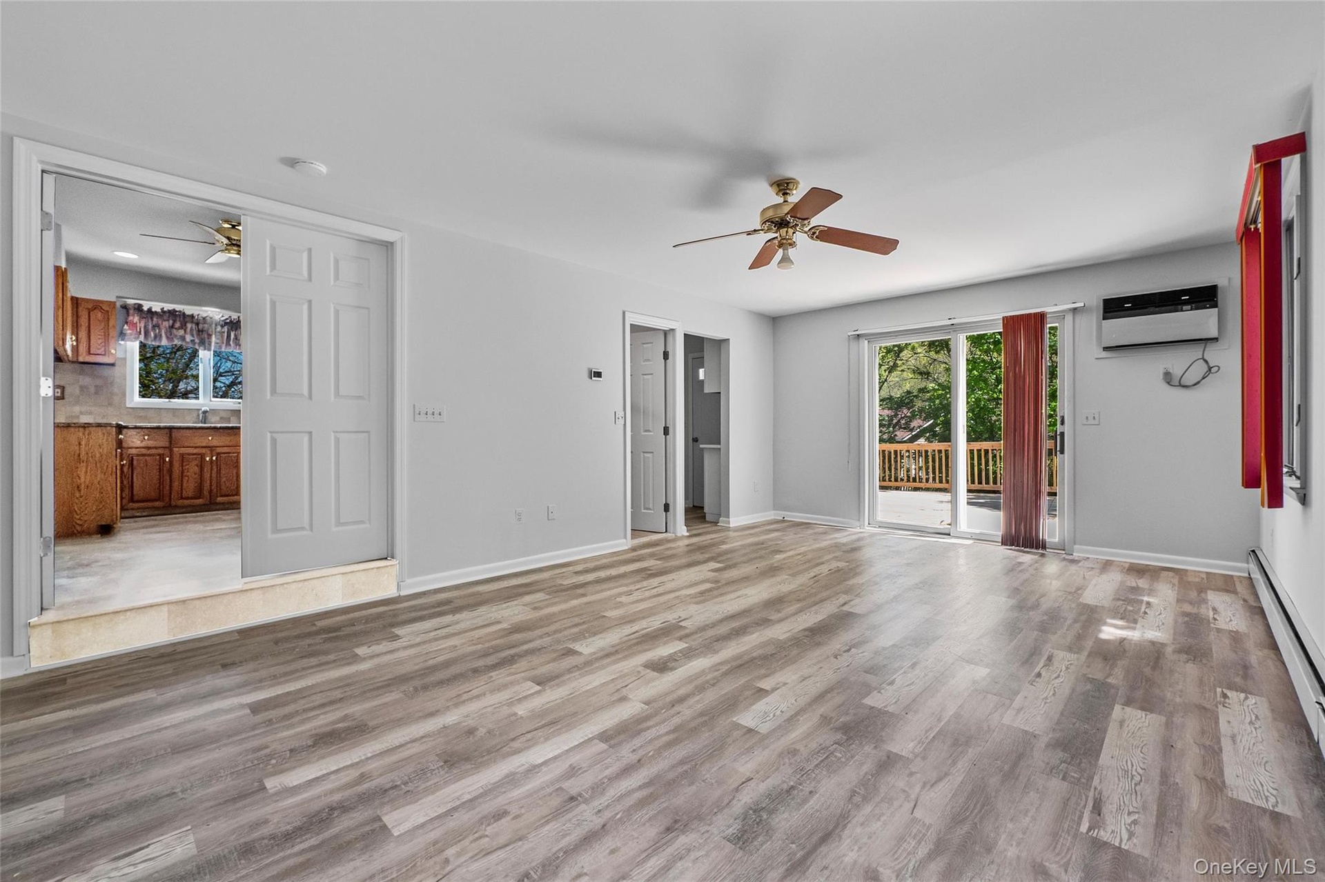 - Unfurnished living room with light wood finished floors, a skylight, baseboard heating, and ceiling fan