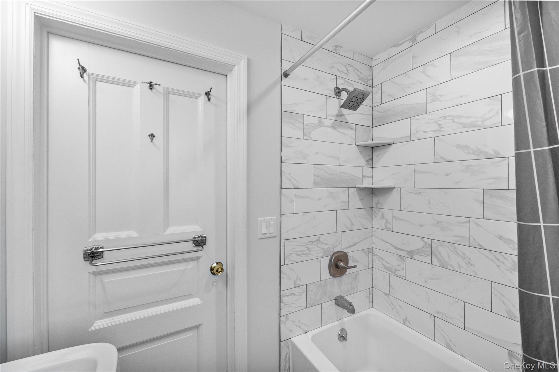 - Bathroom with radiator heating unit and a shower with shower curtain
