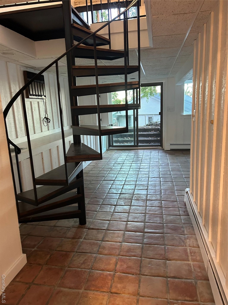 - Empty room with wood walls, a drop ceiling, and baseboard heating