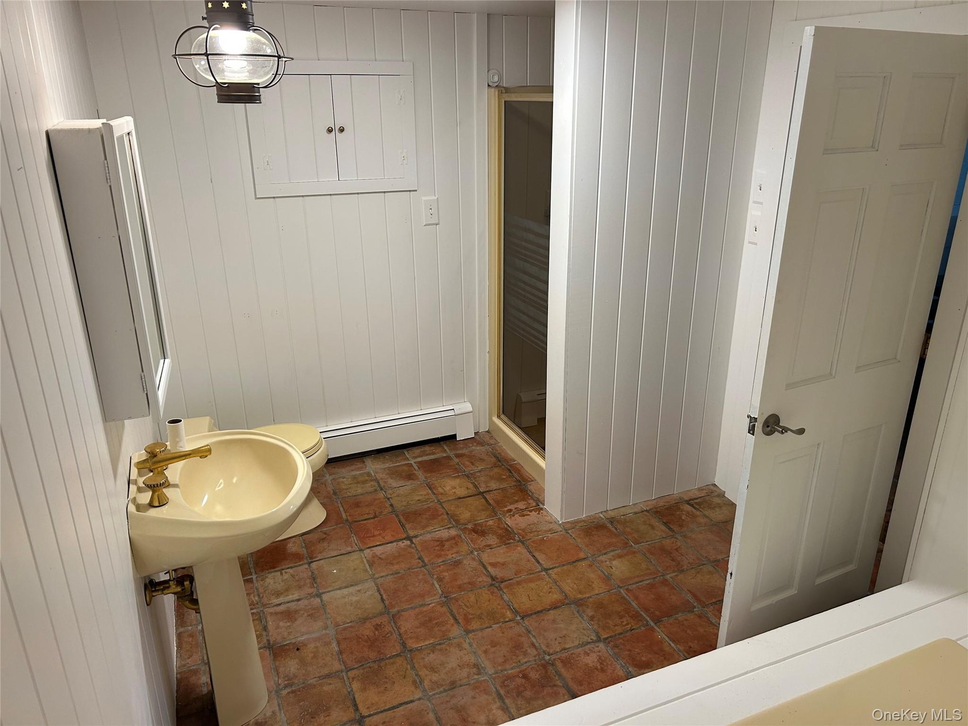 - Full bath featuring a stall shower, wooden walls, a baseboard radiator, and dark tile patterned floors