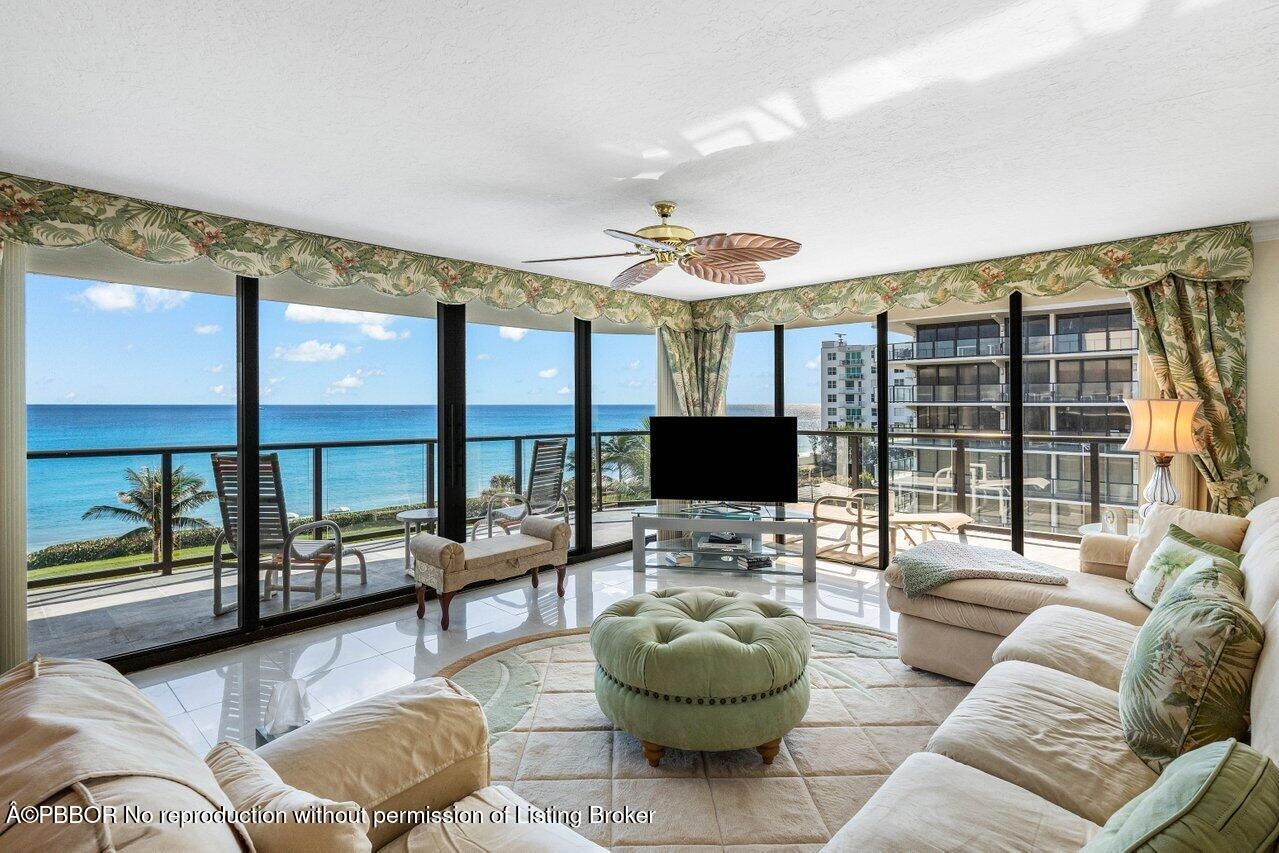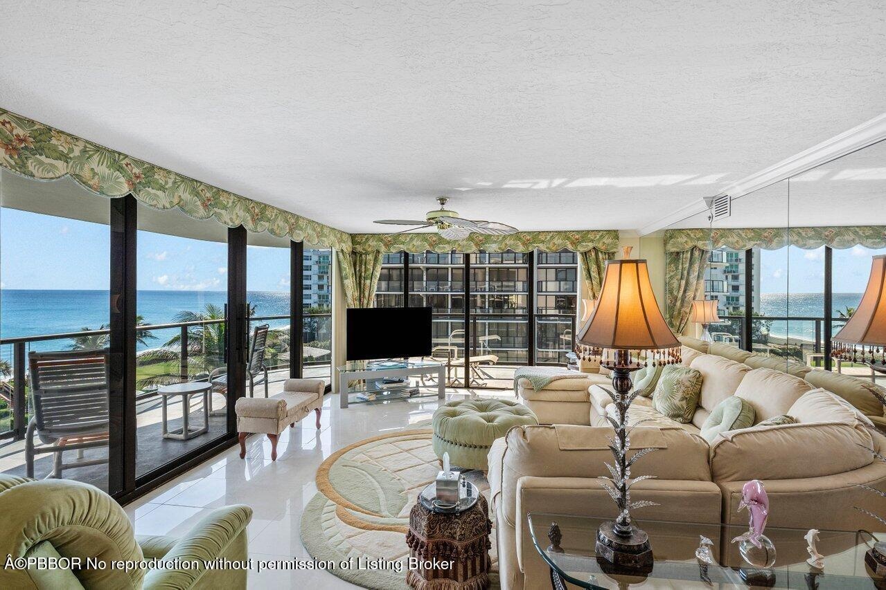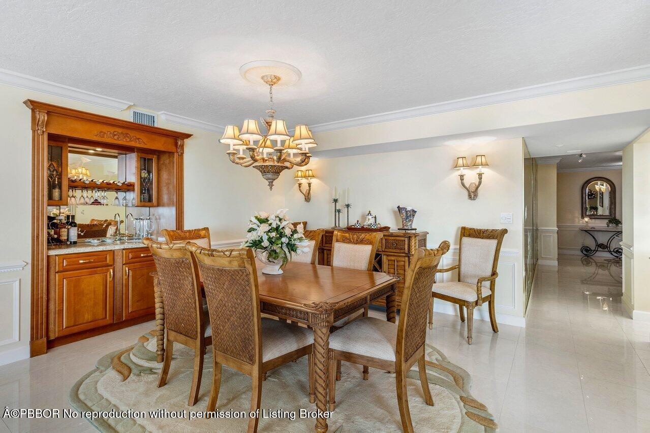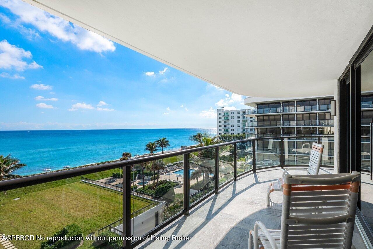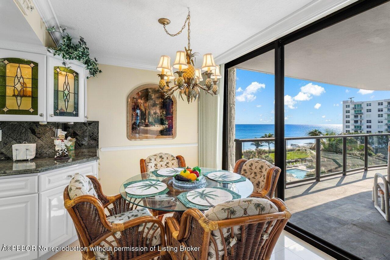 This elegant residence, says ''Palm Beach,'' and greets you with breathtaking views of the sunrise to sunset. Nestled on the 5th floor of the Halcyon's North Building, this spacious two-bedroom, two-bathroom floor plan boasts two glass balconies that offer stunning Southeast Ocean views and panoramic vistas of the Intracoastal. Step inside and you'll be enveloped in a meticulously maintained property. Hurricane-impact doors and glass ensure the safety, while a custom eat-in kitchen, a custom bar with beautiful back-lit etched accent glass, wainscoting walls, custom cabinetry, and attractive stonework add to the home's charm. The Halcyon, where this residence resides, offers a range of amenities to enhance your stay. Enjoy the convenience of 24/7 doormen, a resort-style pool area and beach, 2 Har-Tru tennis courts, a fitness center, storage, and garage parking.