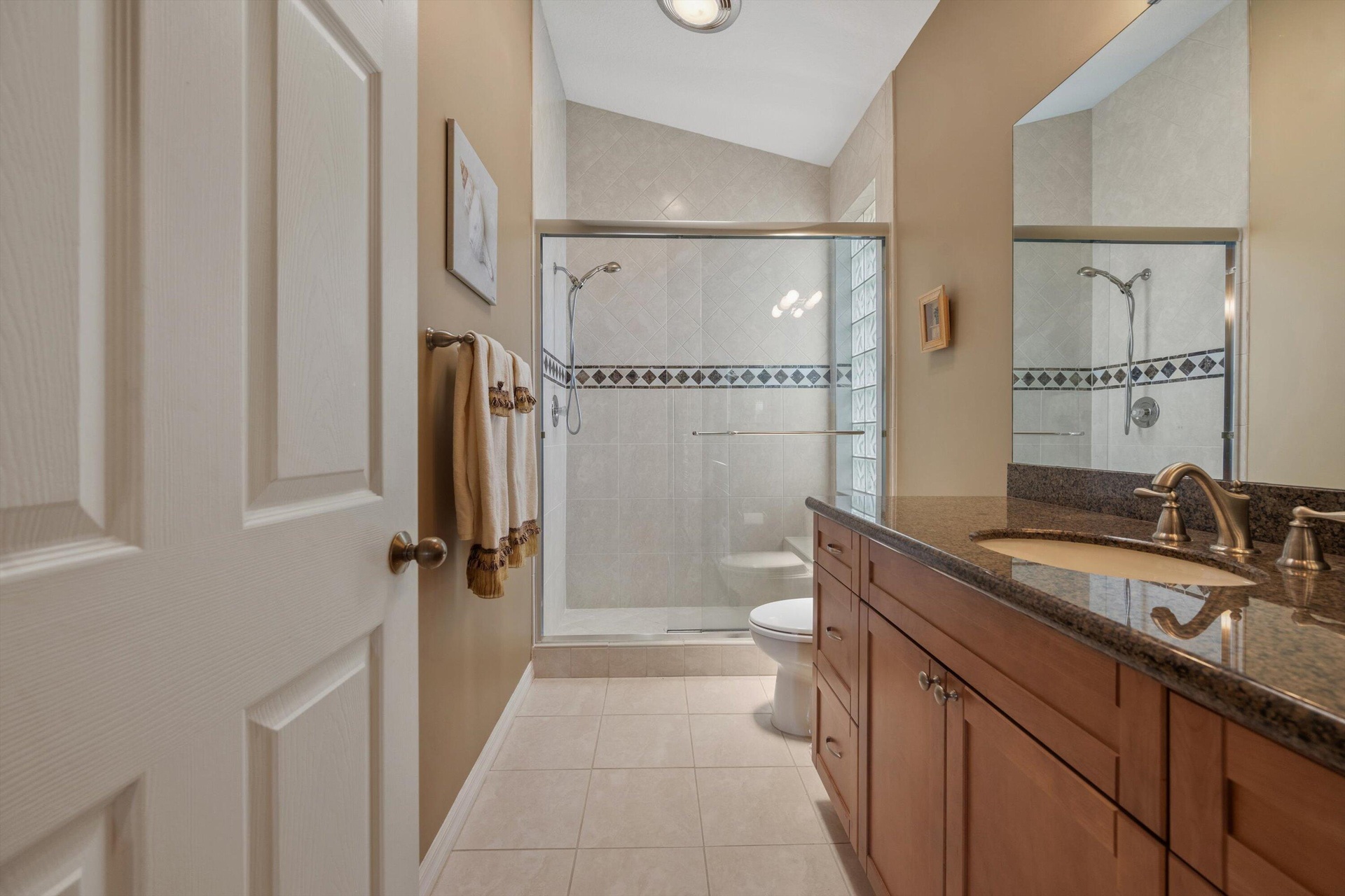 Welcome to luxury living in the highly sought-after Bridgegate community of Jonathan's Landing, a gated golf course neighborhood. This single-story courtyard home with a pool and rare private guest house offers 2,535 sq. ft. of beautifully designed living space. The main residence boasts soaring ceilings, bright open spaces, neutral tile flooring, and two oversized bedrooms. The master suite includes two walk-in closets and a spa-like bath. A 493 sq. ft. addition expanded the master bedroom and added a golf cart garage. The guest house, with its own separate entrance, features one bedroom and a living area, currently configured as a two-bedroom setup. This flexible space is perfect for visitors, in-laws, or a home office.