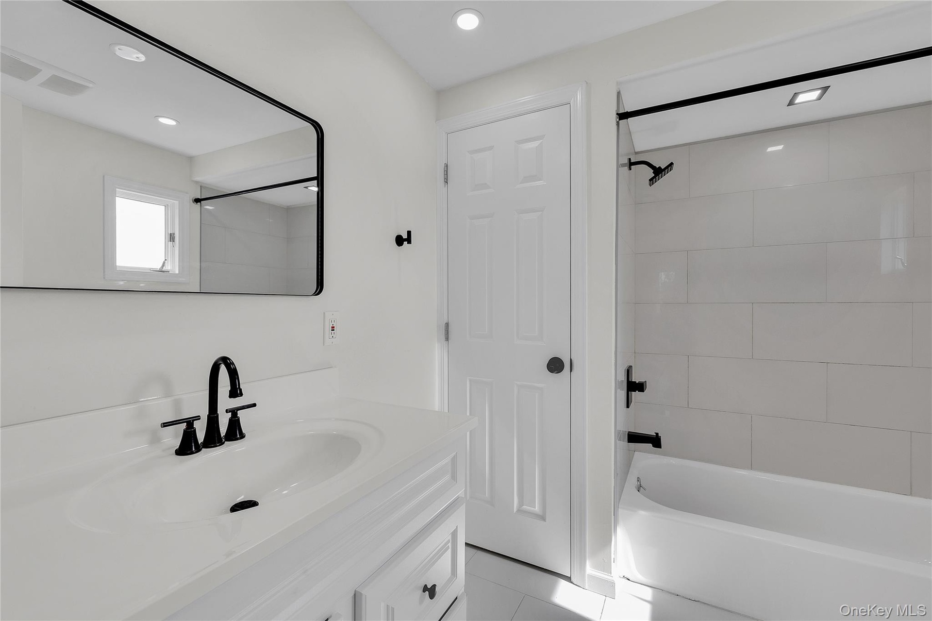 - Full bath with shower / bath combination, vanity, light tile patterned floors, and recessed lighting