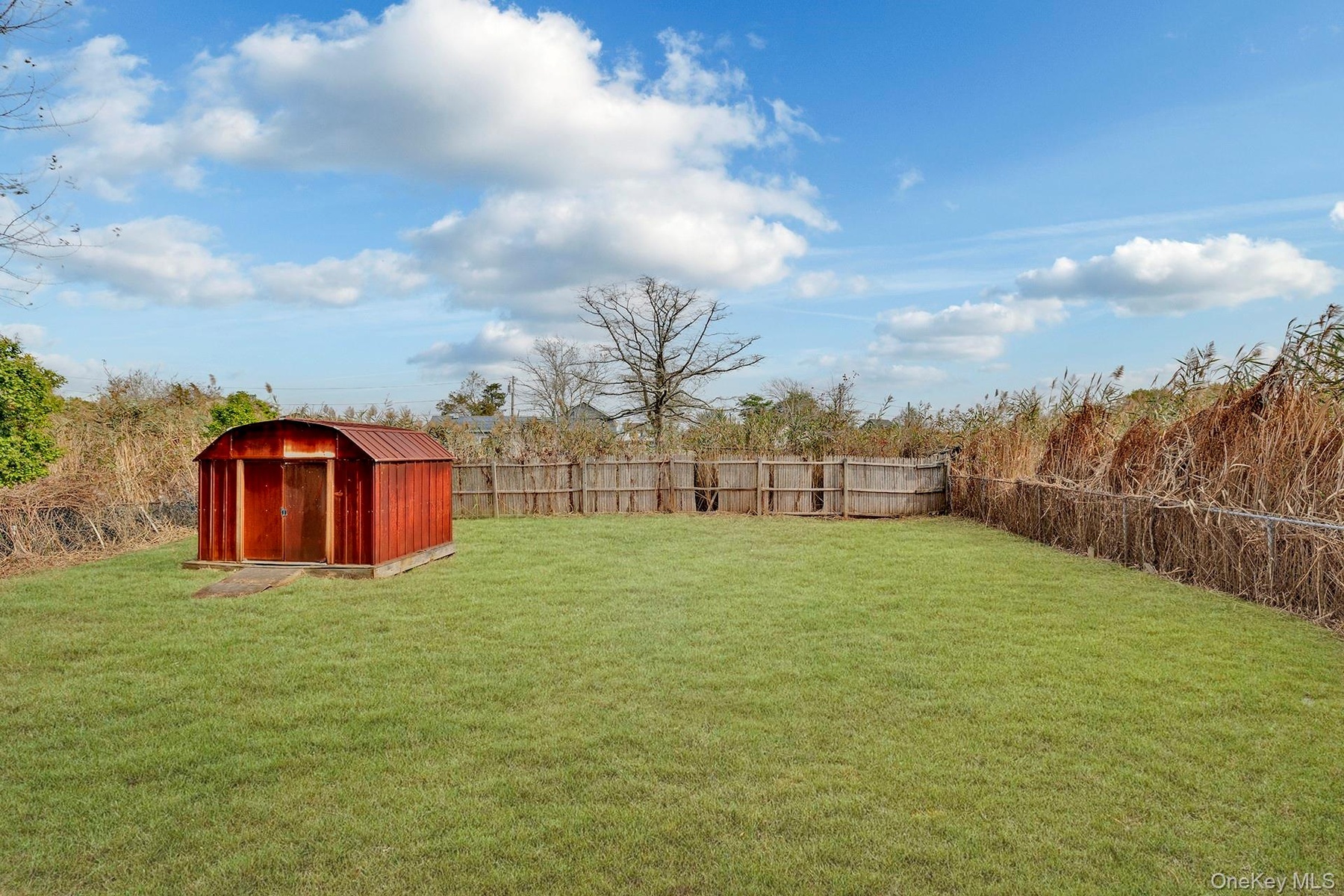 - Fenced backyard with a storage unit