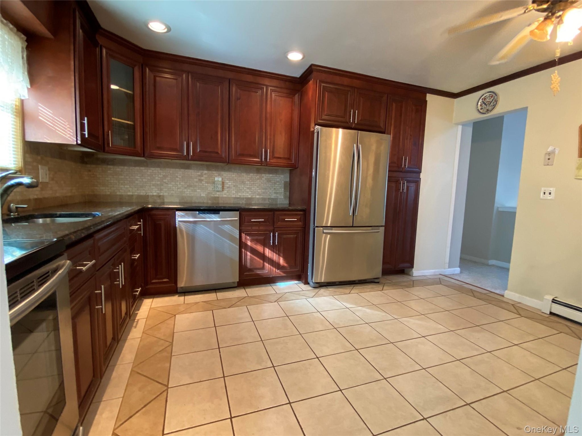 - Kitchen featuring appliances with stainless steel finishes, light tile patterned floors, dark stone counters, decorative backsplash, and glass insert