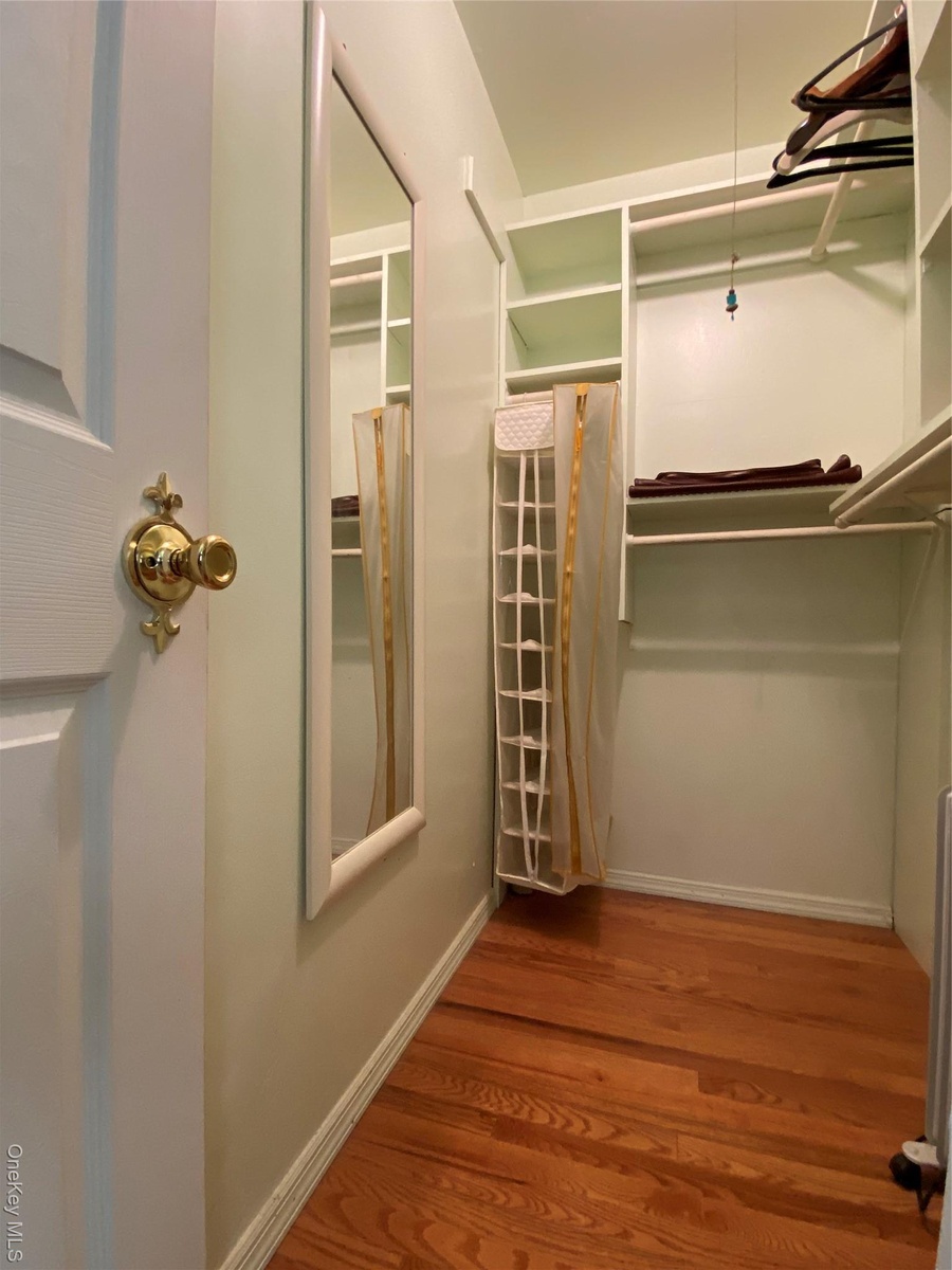 - Unfurnished bedroom featuring ornamental molding, dark wood-type flooring, a closet, and baseboard heating