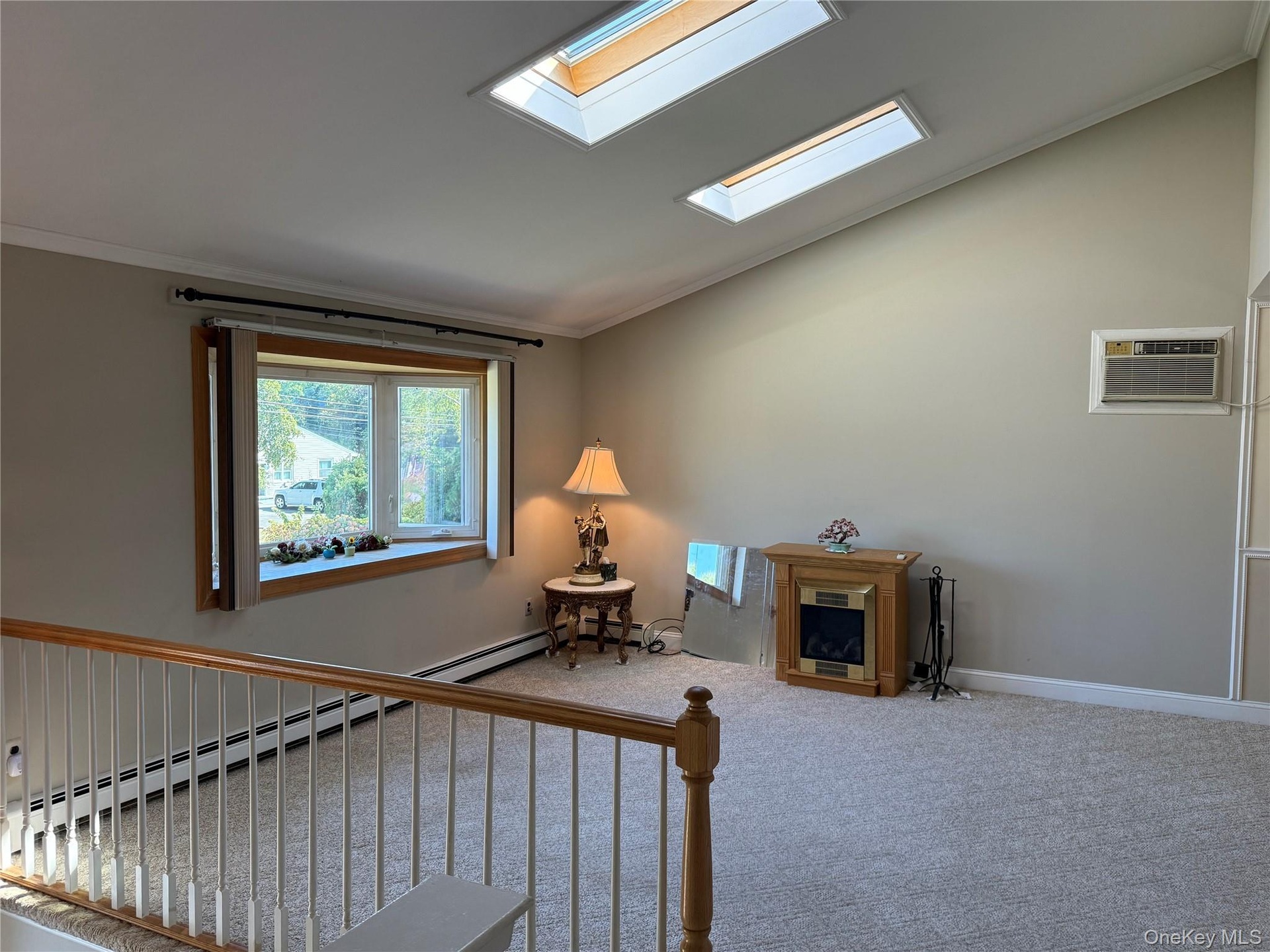 - Sitting room with a skylight, carpet flooring, lofted ceiling, crown molding, and a baseboard radiator