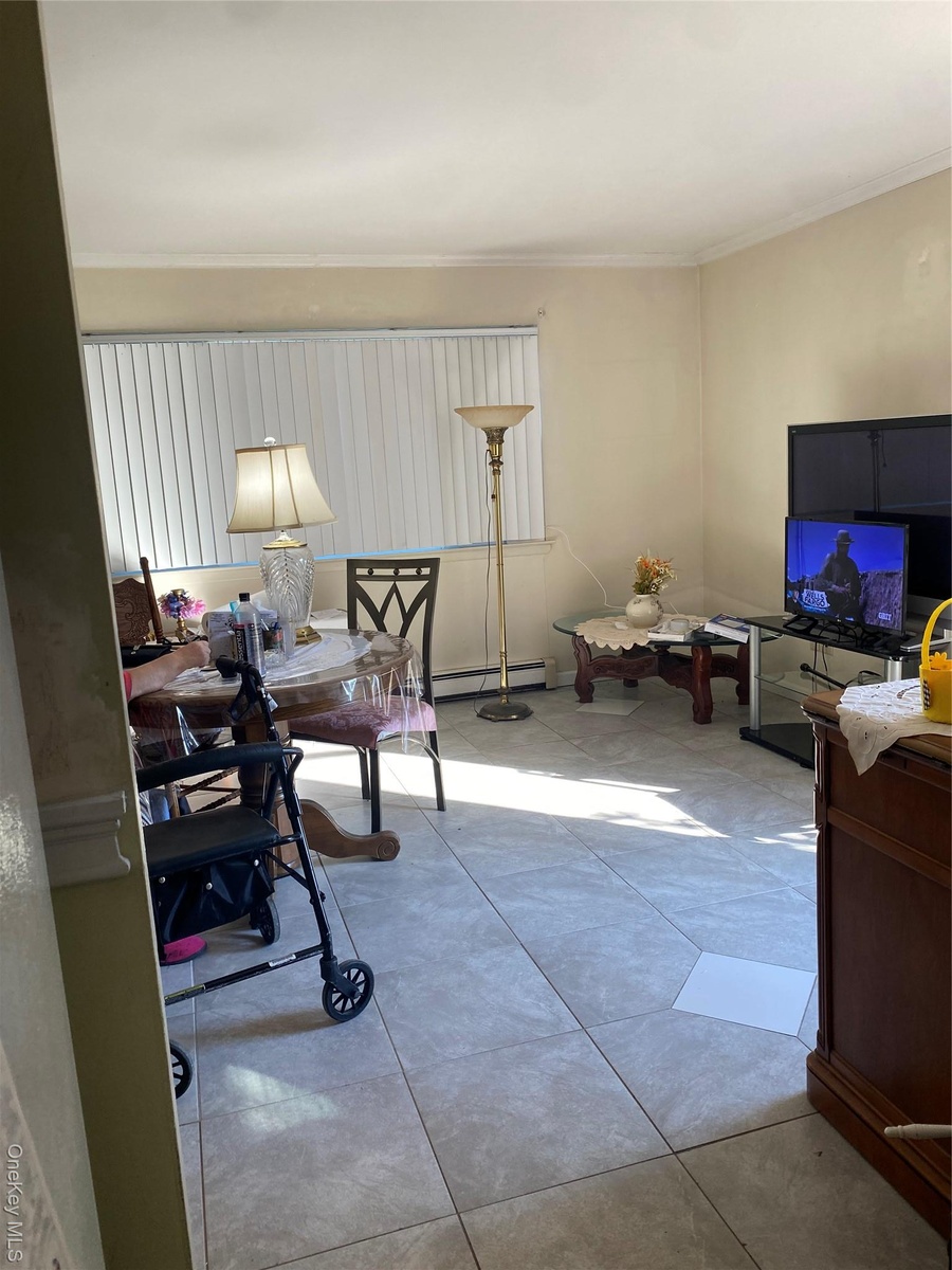 - Home office featuring ornamental molding, light tile patterned flooring, and a baseboard heating unit