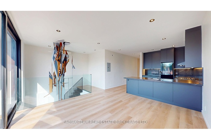 Bright and thoughtfully designed, this 2-bedroom suite offers 990 sq.ft. of modern living in Torontos Junction. A functional entryway with a proper foyer leads upstairs to the open main level, where soaring 9' ceilings and pot lights create an inviting space. The spacious living/dining area flows seamlessly to a large south-facing deck through sliding glass doors, enhanced by a striking large-scale artwork from a renowned Toronto artist. The sleek all-black kitchen features double undermount sink, quartz counters and backsplash, and full-sized appliances including a dishwasher. Both bedrooms have large picture windows with custom roller shades, and the landlord is willing to install a wardrobe in one of the rooms based on tenant preference. The spa-like 6-piece bath features a skylight, steam shower, and soaking tub. A separate laundry room with Bloomberg washer/dryer and cabinetry adds convenience. Heated floors run throughout, with AC units in both bedrooms and the living area. Parking, exterior maintenance, heat, water, and HRV system are all included. Located within the Junctions vibrant mix of shops, cafés, and restaurants, with easy access to the Stockyards, Bloor West Village, top schools including Annette Jr & Sr, Humberside CI, and frequent TTC service. This is urban living at its best.