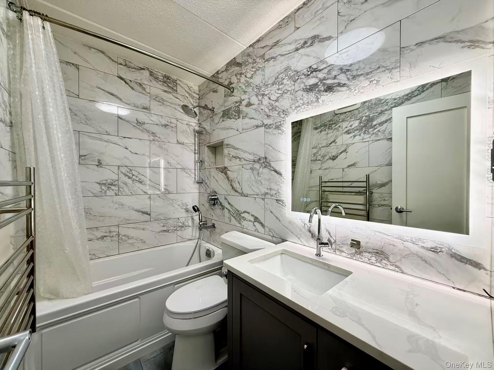 - Bathroom with shower / tub combo with curtain, tile walls, vanity, a towel warming rack, and a textured ceiling