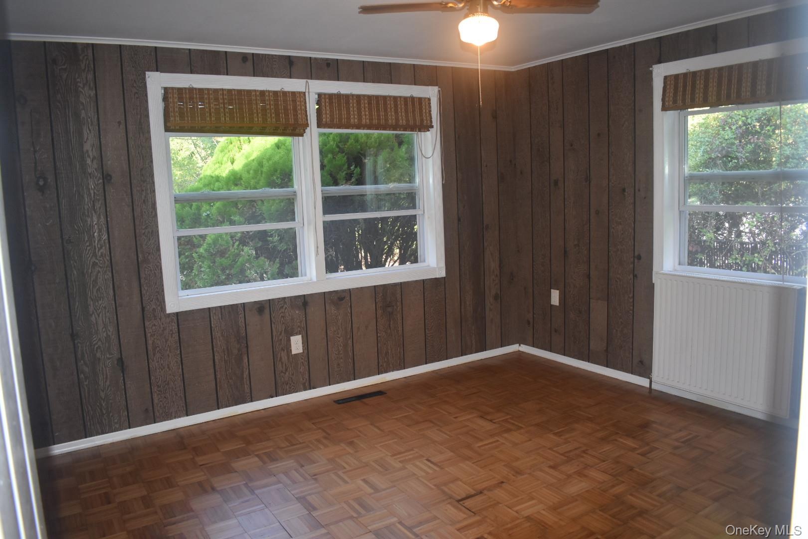 - Empty room featuring a ceiling fan, crown molding, and wooden walls