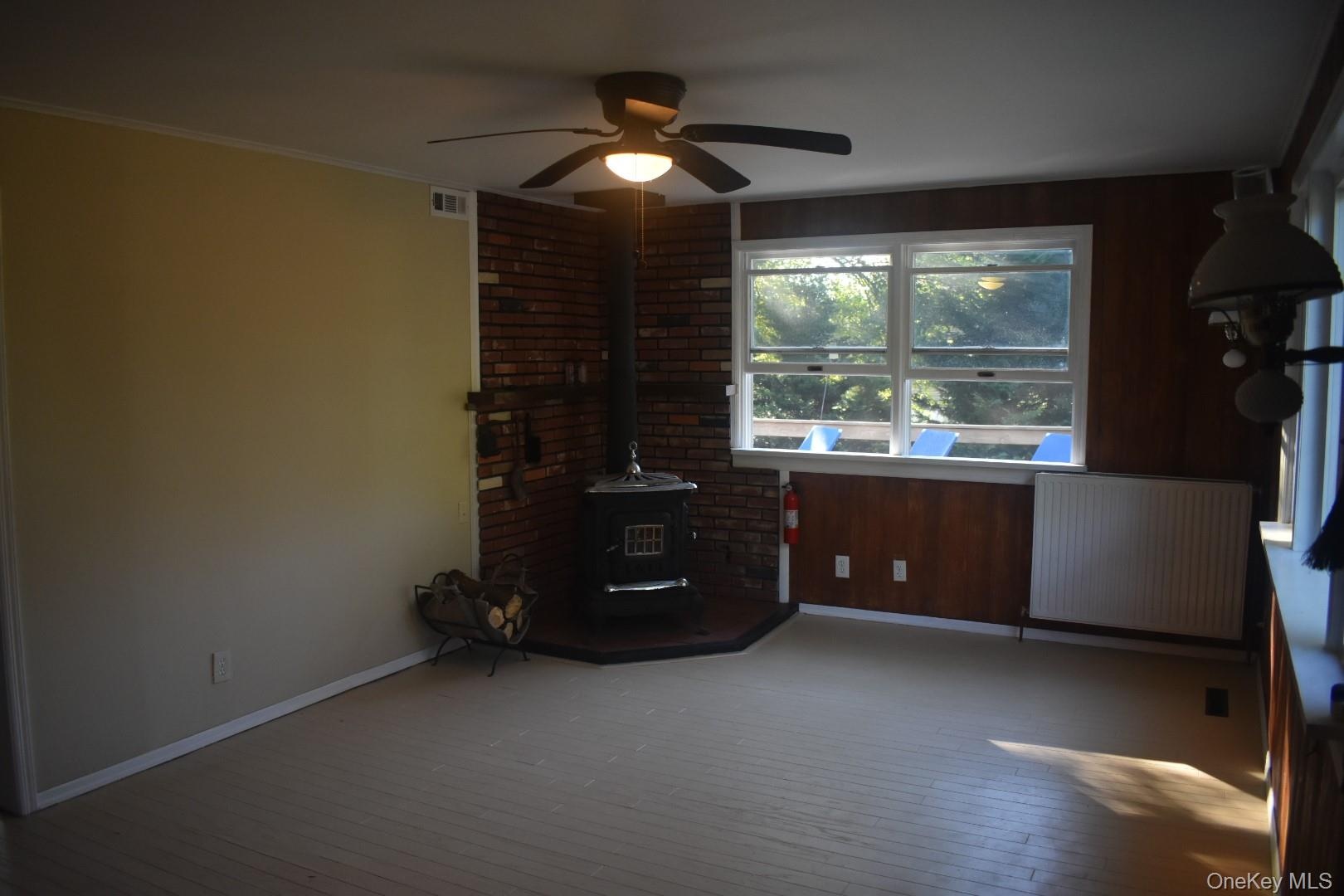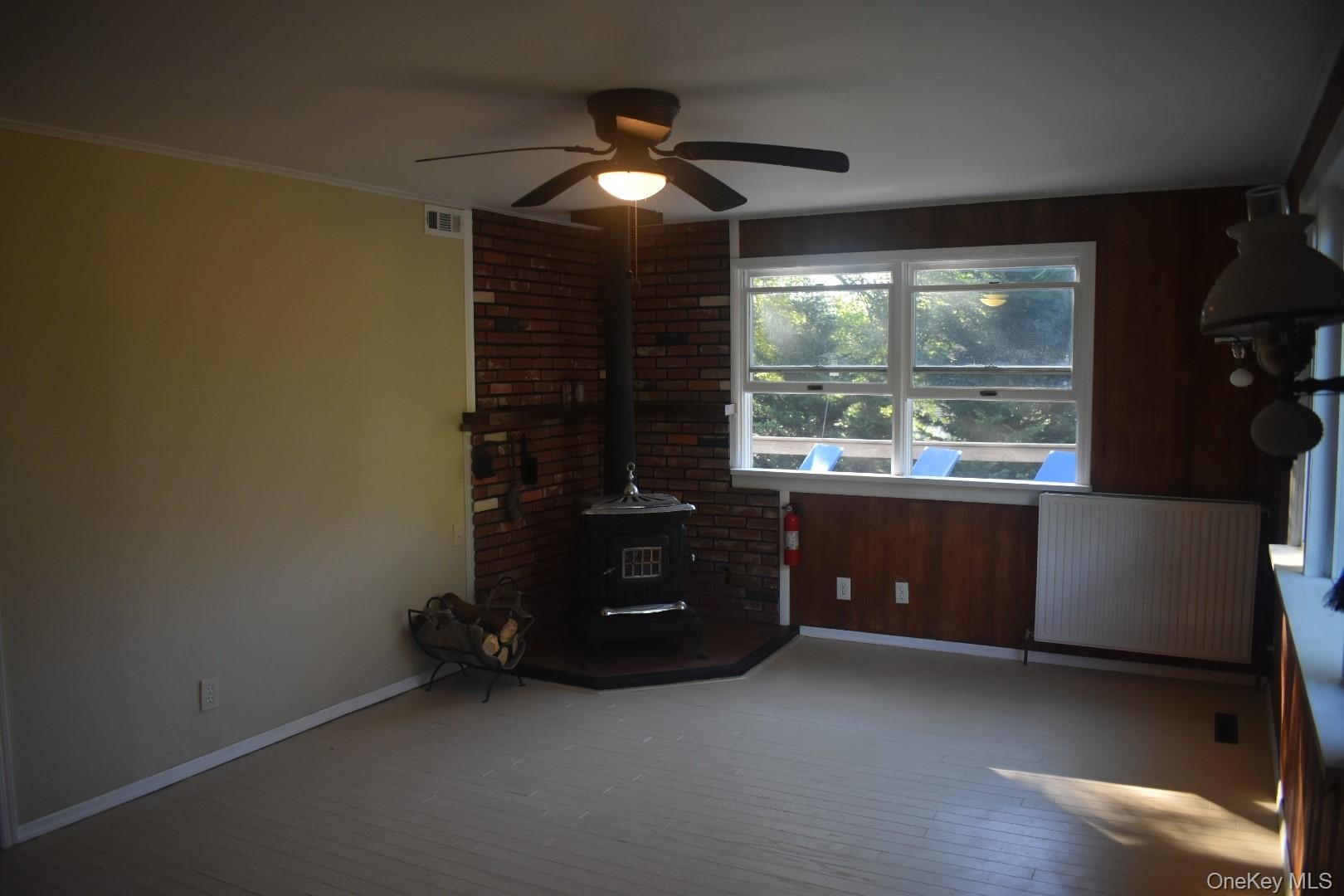 - Unfurnished sunroom featuring a wood stove and radiator heating unit
