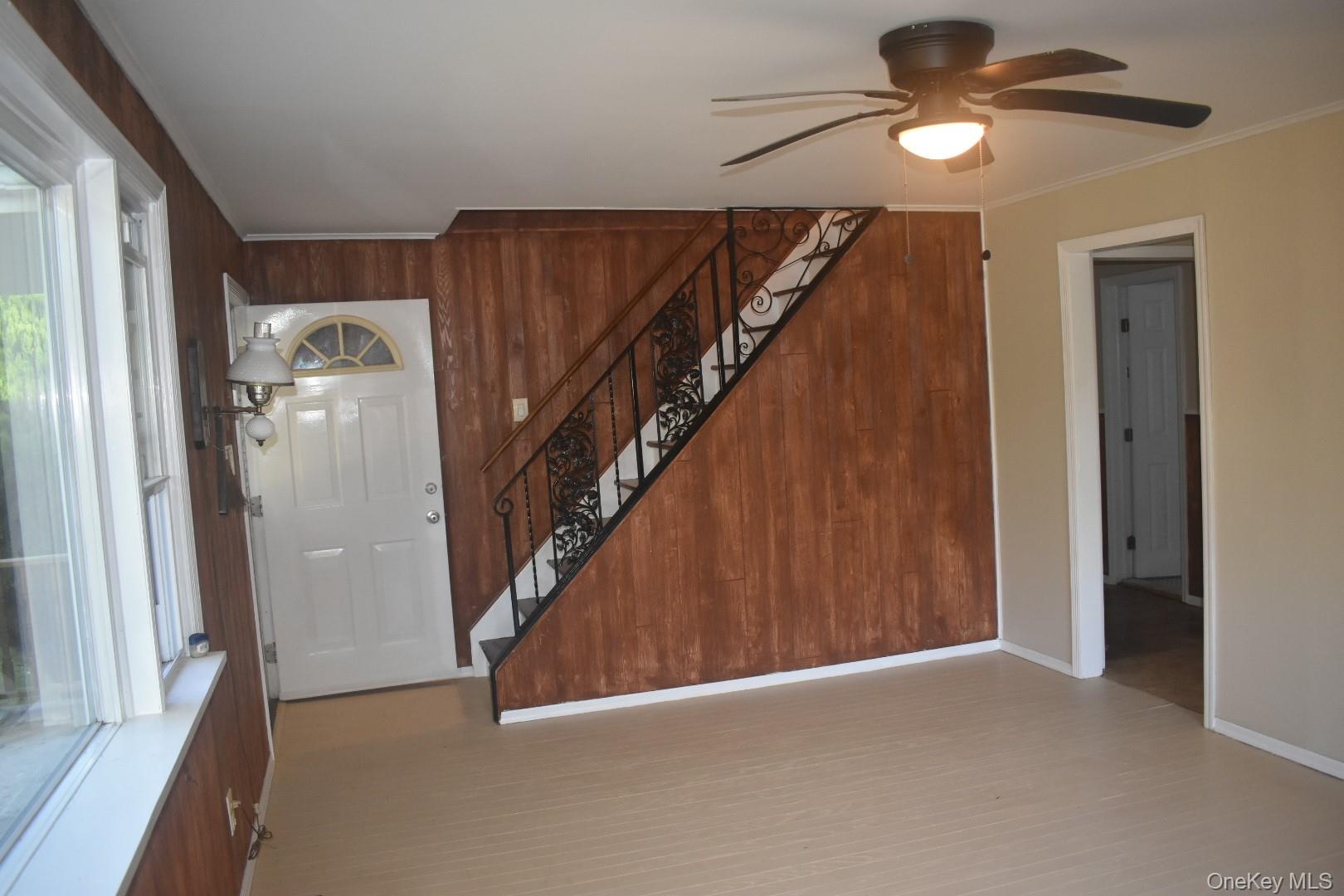 - Entrance foyer featuring wood walls, stairs, crown molding, light wood-style flooring, and ceiling fan
