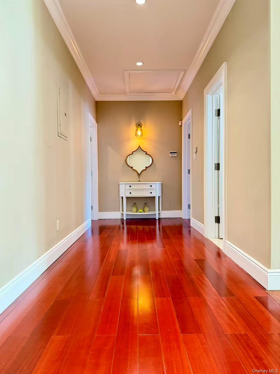 - Hallway featuring crown molding, attic access, wood finished floors, and recessed lighting