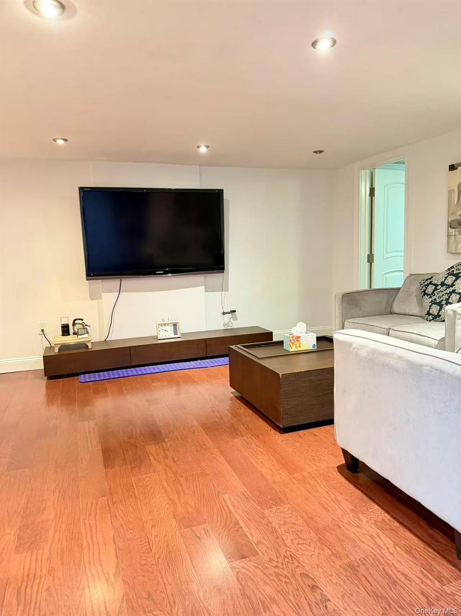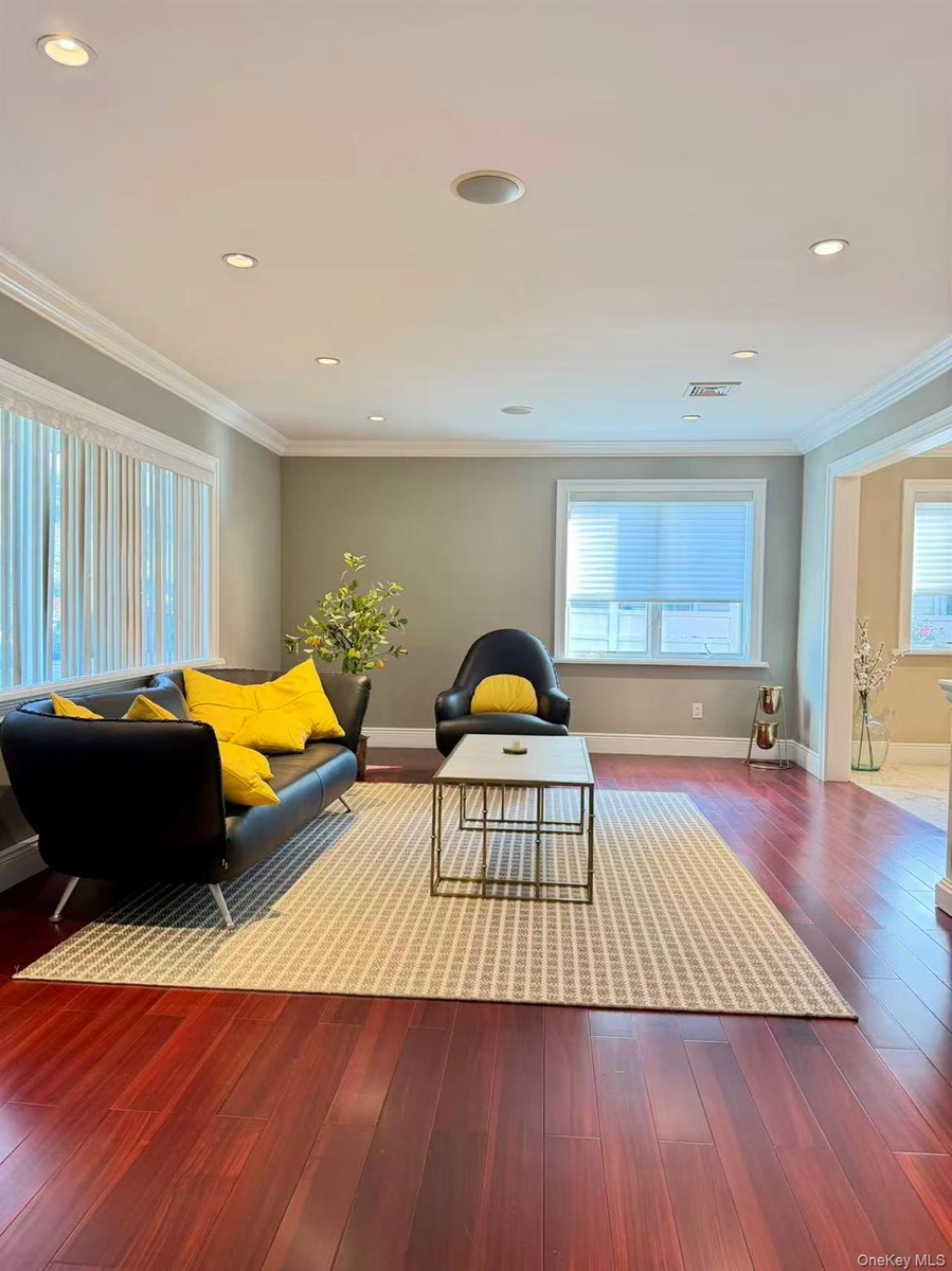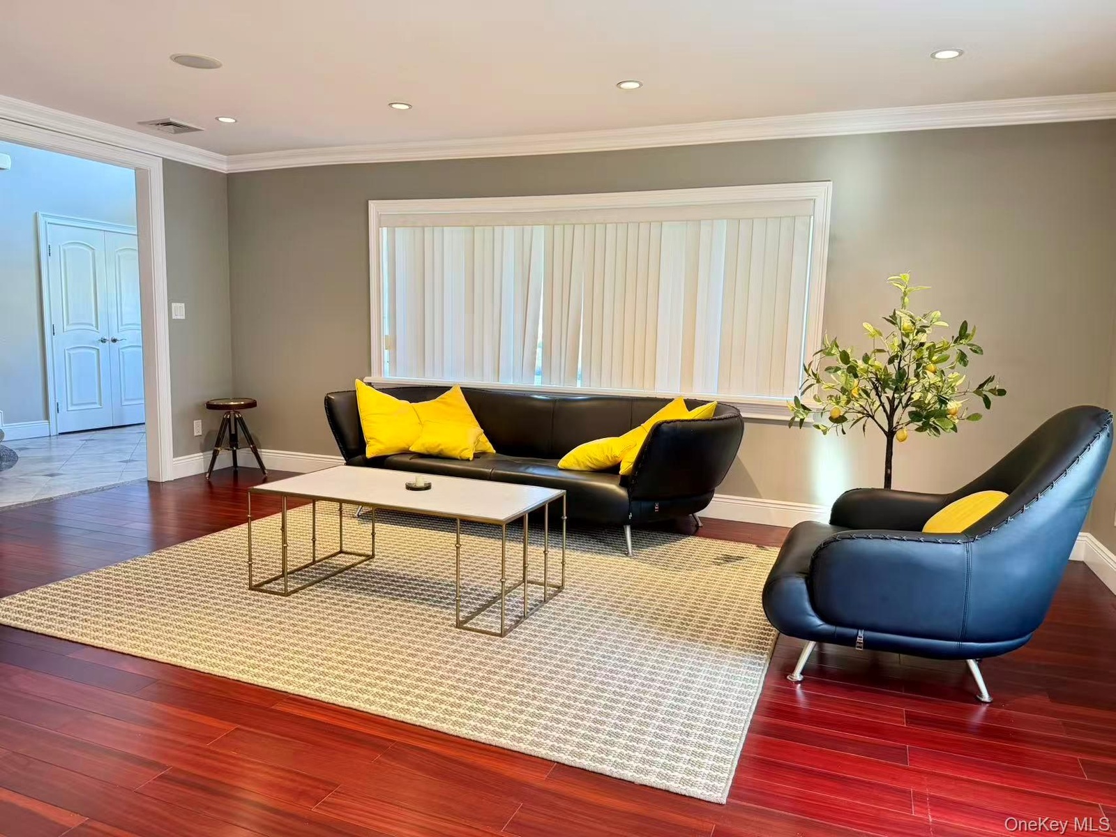 - Living room featuring wood finished floors, ornamental molding, and recessed lighting