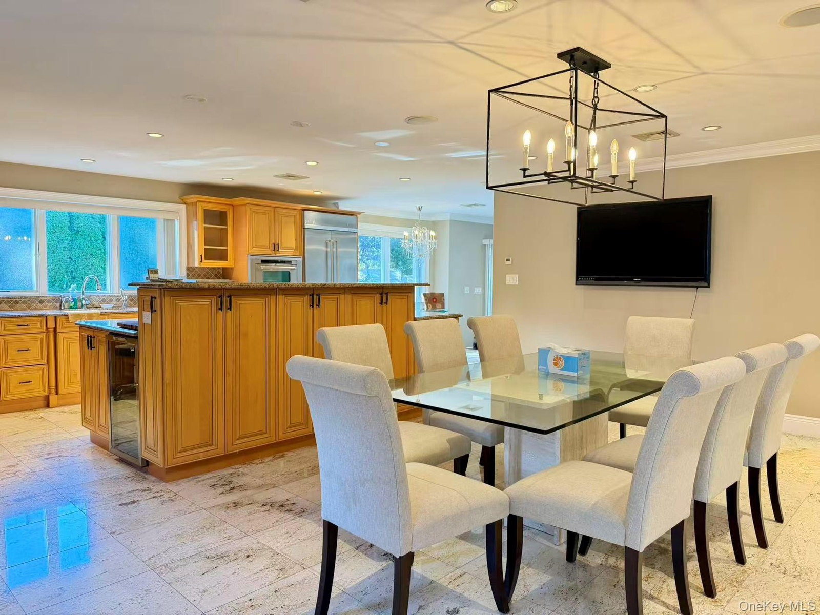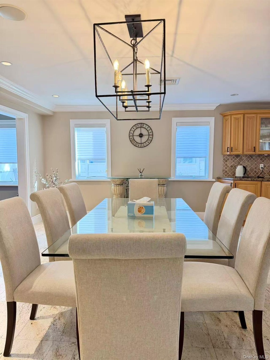 - Dining room featuring plenty of natural light, recessed lighting, a chandelier, and crown molding
