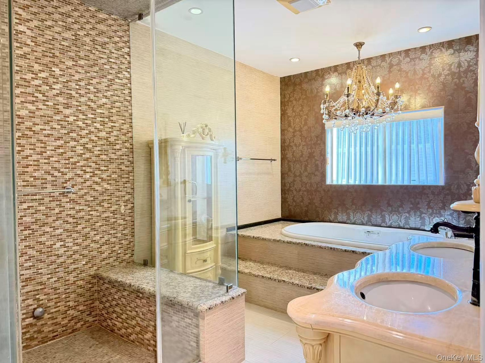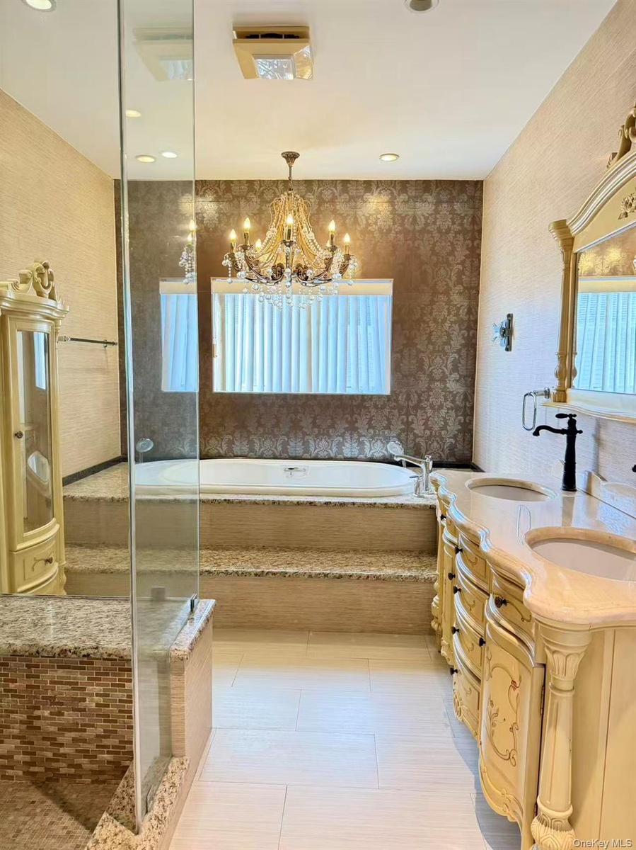 - Full bath with healthy amount of natural light, double vanity, a bath, and a chandelier