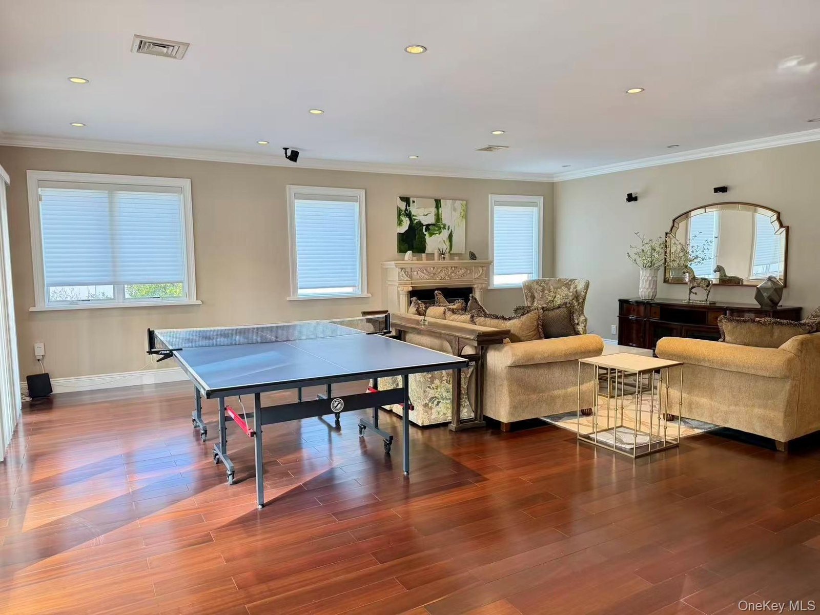 - Rec room with crown molding, a fireplace, recessed lighting, and wood finished floors