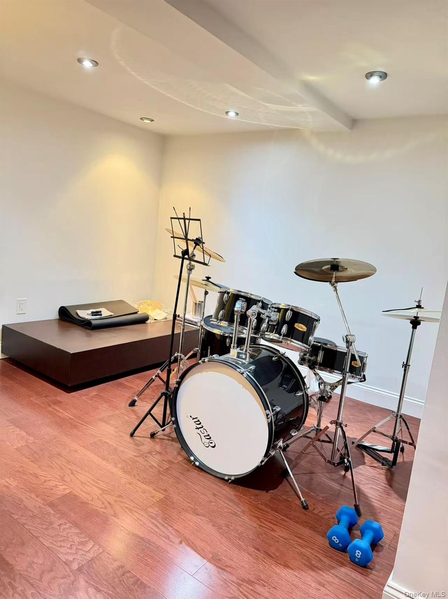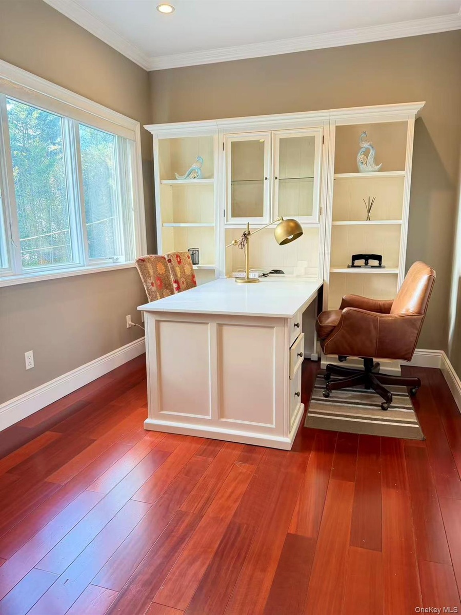 - Sitting room with crown molding, wood finished floors, and recessed lighting