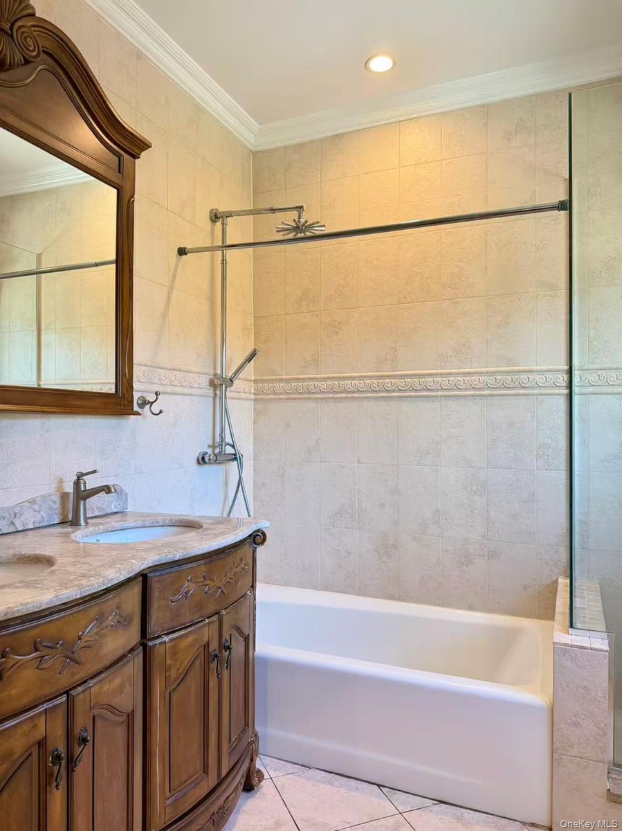 - Full bath with bathtub / shower combination, crown molding, double vanity, and light tile patterned floors