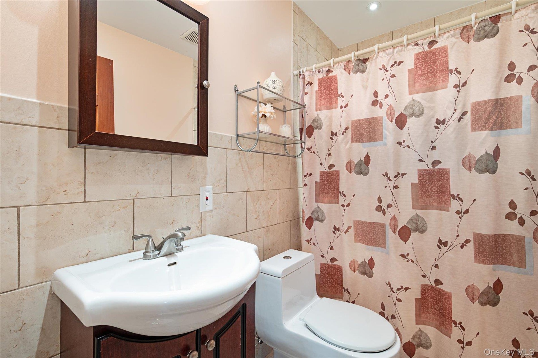 - Full bath with tile walls, vanity, a shower with shower curtain, and decorative backsplash
