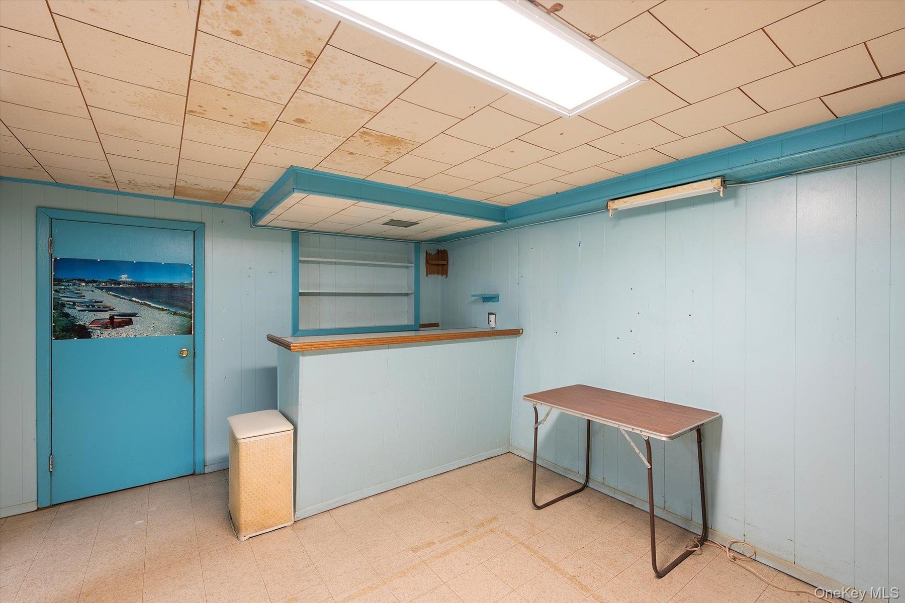 - Indoor dry bar with tile patterned floors and wood walls