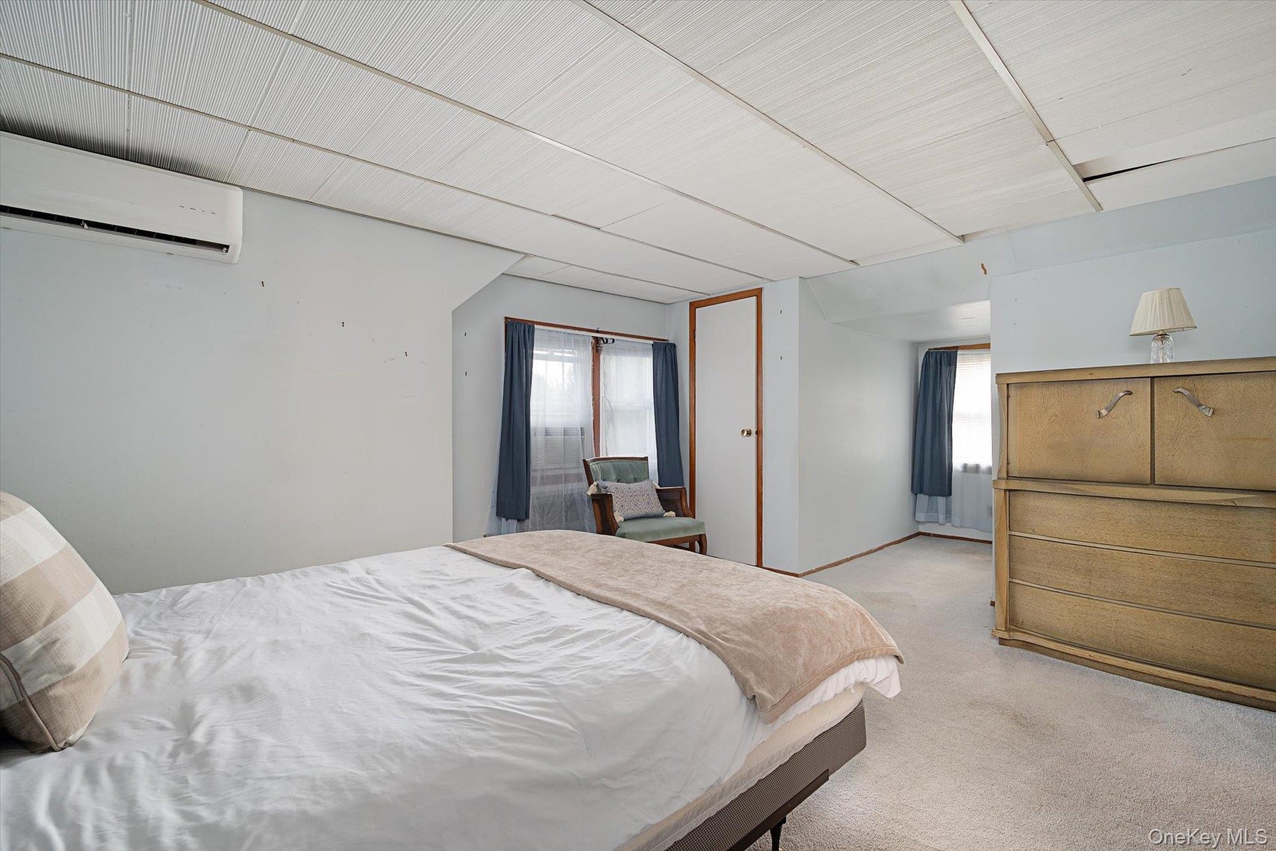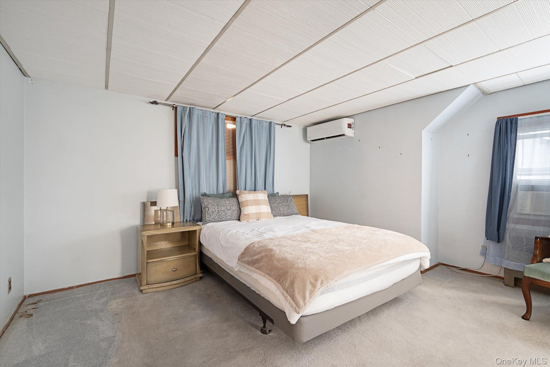 - Carpeted bedroom featuring an AC wall unit and multiple windows