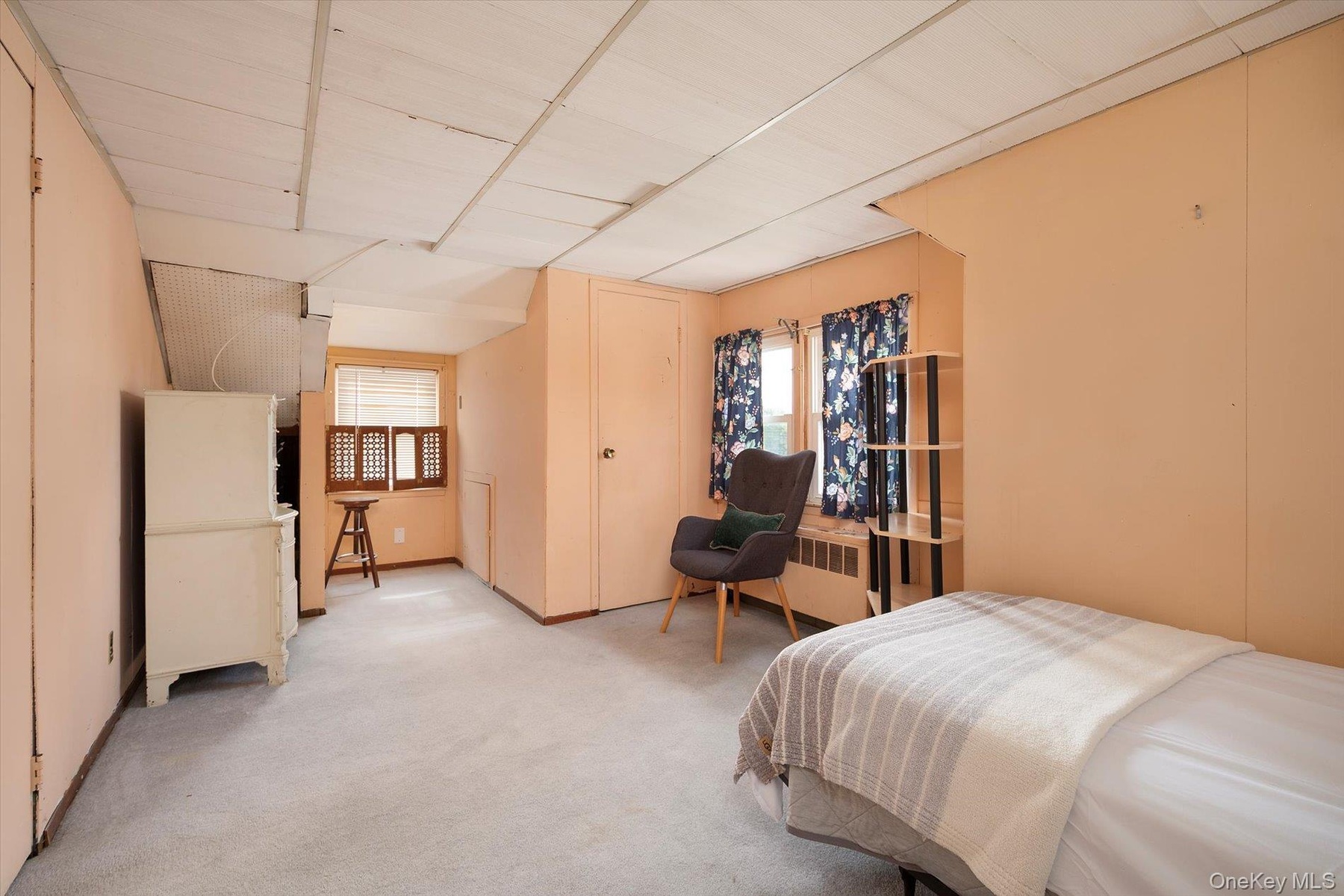 - Bedroom with carpet floors and radiator