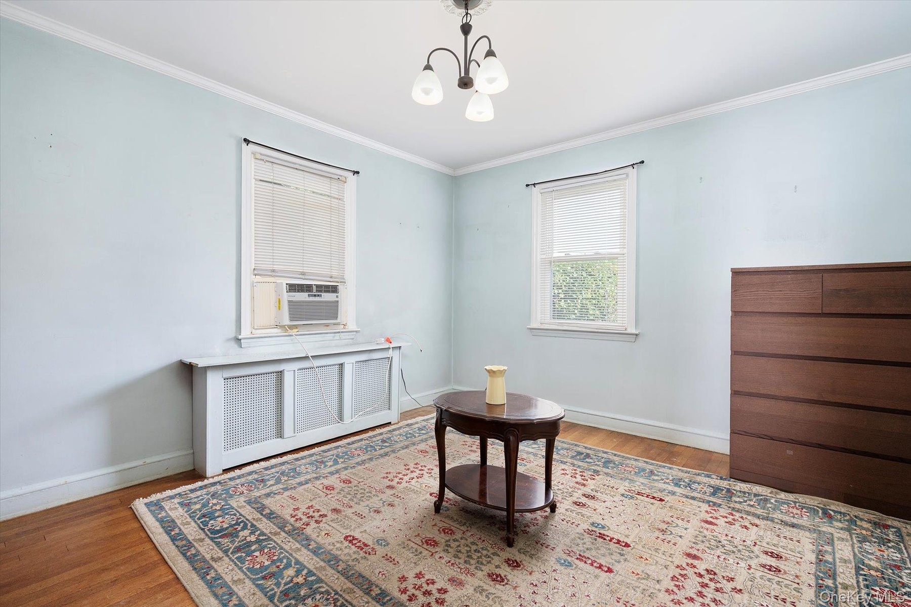 - Living area featuring crown molding, radiator heating unit, wood finished floors, a chandelier, and cooling unit