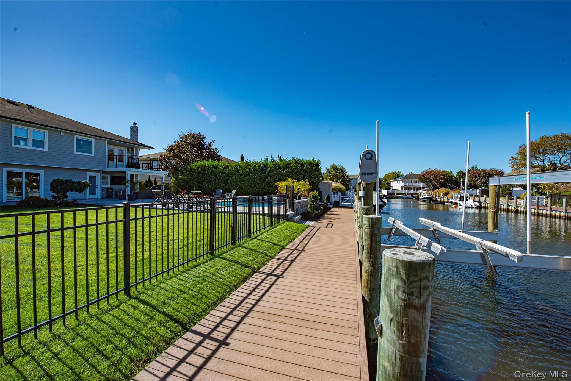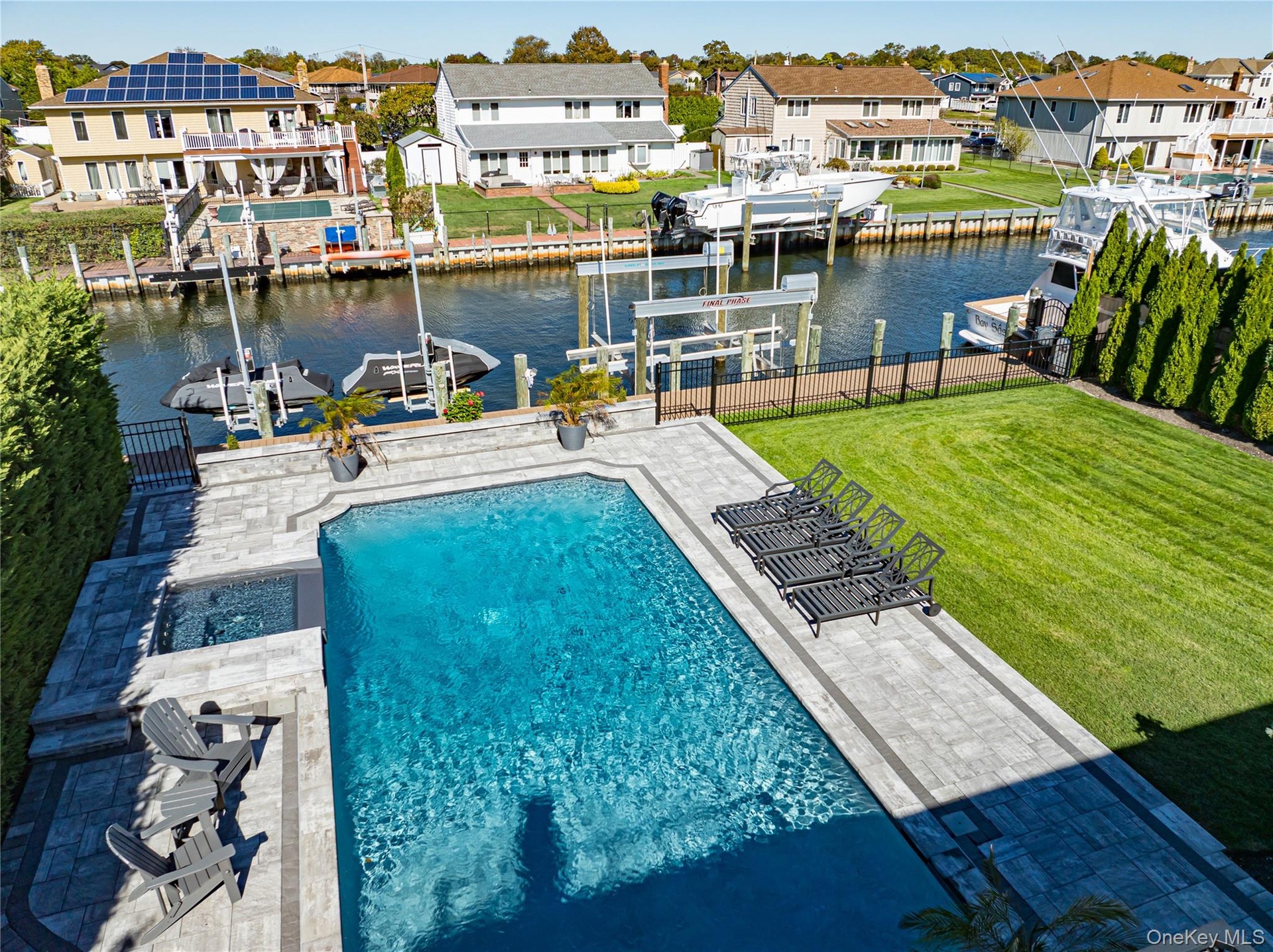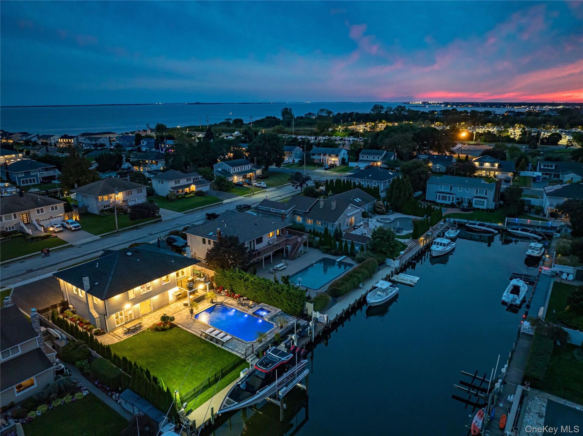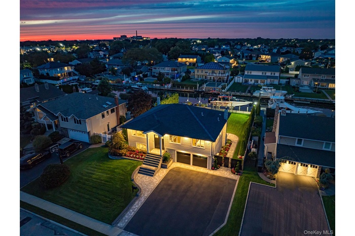 Located on a quiet, private cul-de-sac, this pristine wide-line Hi Ranch offers the perfect blend of luxury, privacy, and waterfront living. The entry foyer leads to a spacious living room with an electric fireplace, formal dining room with access to a second-story balcony overlooking the yard, saltwater gunite pool, hot tub, and 75' of waterfront. The custom center-island kitchen includes a large pantry, with stainless steel and Energy Star appliances. The primary suite features a luxurious private bath and an adjacent lavish, custom-designed walk-in wardrobe. Two additional bedrooms and a full bath complete the upper level, which boasts dark walnut-stained hardwood floors. Radiant heat floors are found in all bathrooms and the laundry room. The lower level includes a large bedroom, den with a wood-burning fireplace and ceramic flooring, full bath, cedar closet, oversized laundry room with dual washers/dryers and a custom built in dog washing station to keep your four-legged friends clean and pampered without leaving home, and access to a heated 2-car garage. Upgrades include all new Andersen windows (except three rear), 2023 updates throughout, central air with an additional ductless unit in the primary suite, and a whole-home H2O system. The 75’ bulkhead (replaced in 2015) includes a 22,000-lb boat lift, one jet ski lift, and a dedicated 100-amp dock panel. Flood insurance and elevation certificate available upon request. This home is truly in immaculate, nearly "unlived-in" condition—an exceptional waterfront opportunity.
