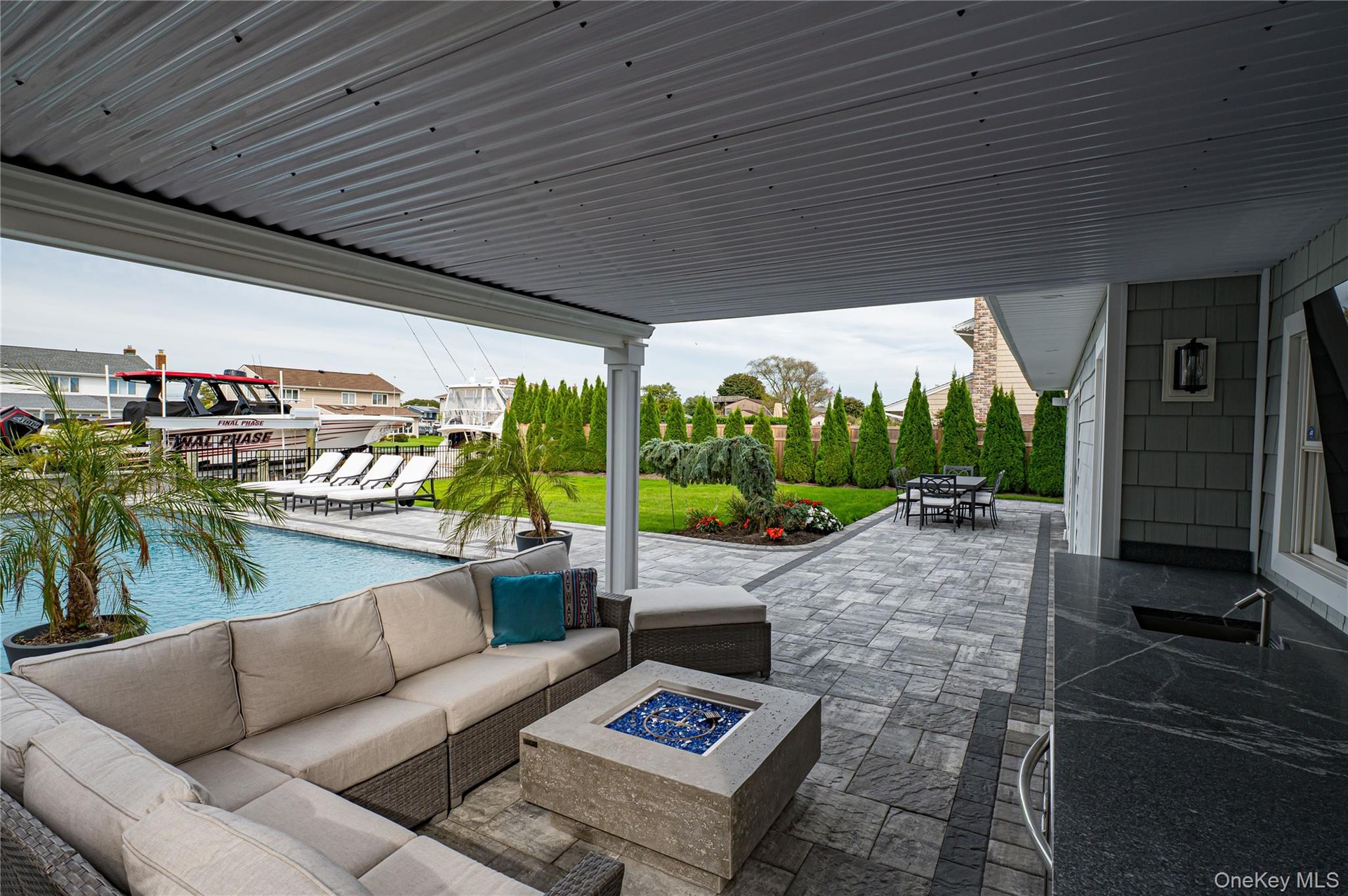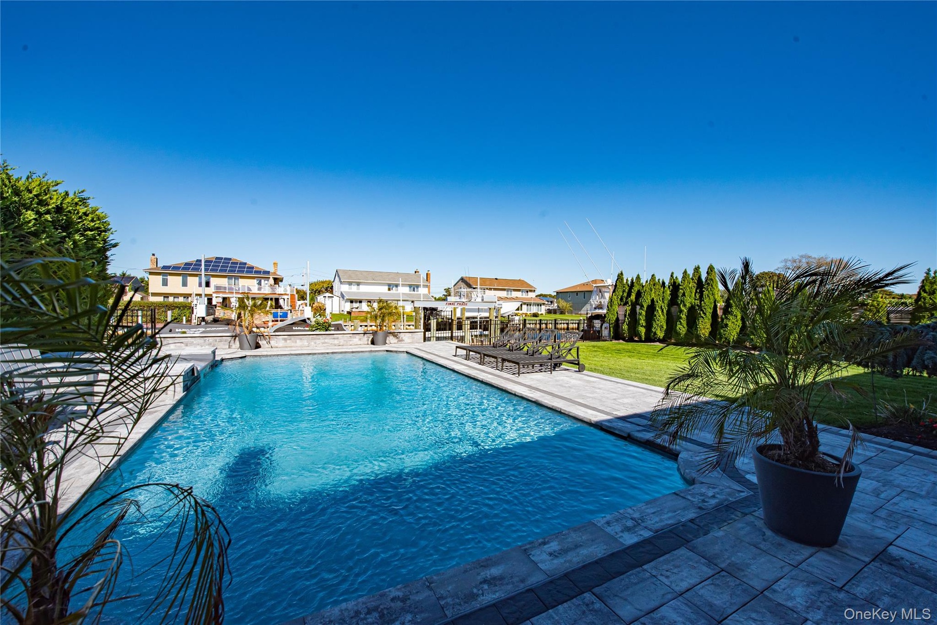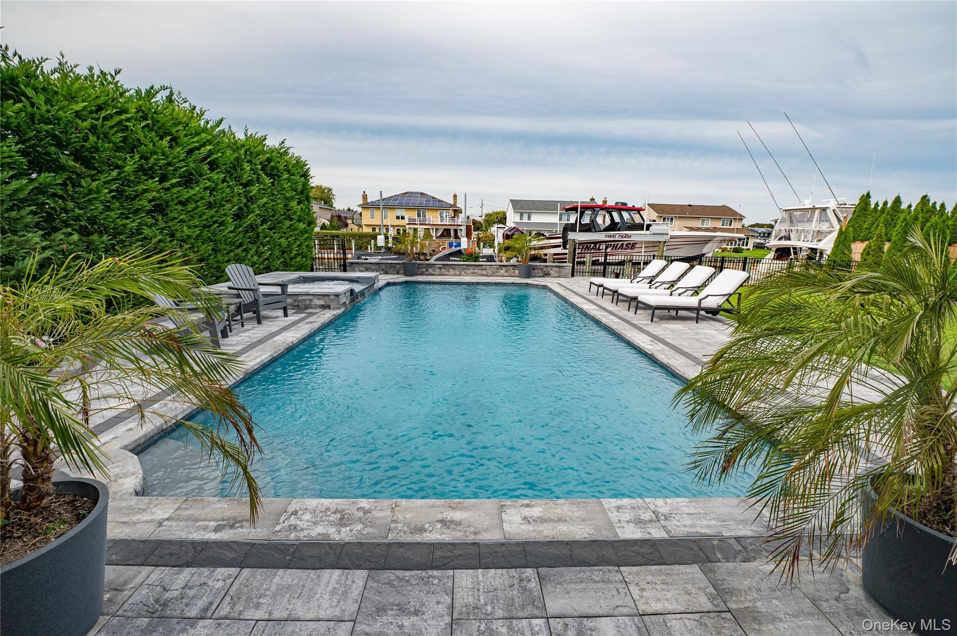 Located on a quiet, private cul-de-sac, this pristine wide-line Hi Ranch offers the perfect blend of luxury, privacy, and waterfront living. The entry foyer leads to a spacious living room with an electric fireplace, formal dining room with access to a second-story balcony overlooking the yard, saltwater gunite pool, hot tub, and 75' of waterfront. The custom center-island kitchen includes a large pantry, with stainless steel and Energy Star appliances. The primary suite features a luxurious private bath and an adjacent lavish, custom-designed walk-in wardrobe. Two additional bedrooms and a full bath complete the upper level, which boasts dark walnut-stained hardwood floors. Radiant heat floors are found in all bathrooms and the laundry room. The lower level includes a large bedroom, den with a wood-burning fireplace and ceramic flooring, full bath, cedar closet, oversized laundry room with dual washers/dryers and a custom built in dog washing station to keep your four-legged friends clean and pampered without leaving home, and access to a heated 2-car garage. Upgrades include all new Andersen windows (except three rear), 2023 updates throughout, central air with an additional ductless unit in the primary suite, and a whole-home H2O system. The 75’ bulkhead (replaced in 2015) includes a 22,000-lb boat lift, one jet ski lift, and a dedicated 100-amp dock panel. Flood insurance and elevation certificate available upon request. This home is truly in immaculate, nearly "unlived-in" condition—an exceptional waterfront opportunity.