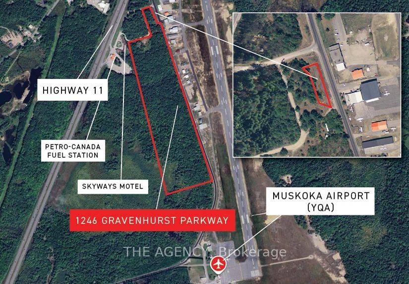 47-ACRE INDUSTRIAL LAND ADJACENT TO CANADIAN INTERNATIONAL AIRPORT. Rare, once-in-a-lifetime land parcel. Nestled beside the Muskoka Airport, surrounded by Crown land, and stewarded for decades by the same family, this 47-acre industrial parcel is more than a land-holding. It is a canvas for visionaries and a chapter waiting to be written by its next caretaker. The Property is located directly across from Muskoka Airport - an international airport and Canada Customs Port of Entry. The side of the property facing Gravenhurst Parkway is directly opposite the airports runway. Key features include: 6,000-foot runway capable of accommodating large jets such as the Globemaster; passenger and freight charter services available; situated on the 45th parallel. Direct access to Highway 11, providing a seamless route south to Toronto Canadas largest metropolitan area with a population of nearly 6.5 million just a two-hour drive from Muskoka Airport. Direct access to Petro-Canada fuel station located at the Highway 11 entry point, enhancing the sites appeal for logistics, travel, and industrial operations. The site borders other notable properties, including Transport Canada land, Town of Gravenhurst land, and Skyways Motel. Environmentally approved. The property contains a cluster of wells sufficient to support a subdivision plus two deep wells. The 280 ft deep well - natural spring water - flow rate of over 30 gpm. Purchase of the property would include sale of privately held subsurface mineral rights - this is exceptional as mineral rights are typically held by the Crown. Freehold - uncommon - industrial land this close to an international airport in North America is usually just leasehold.