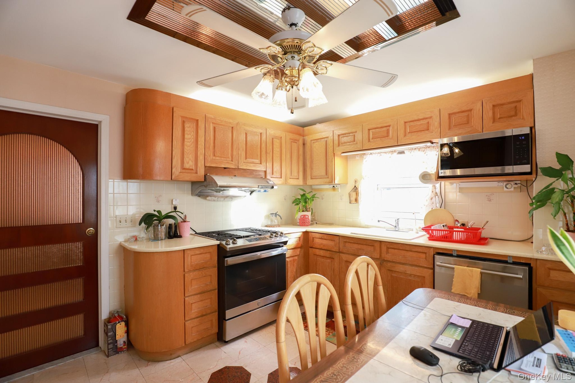 - Kitchen with tasteful backsplash, light countertops, appliances with stainless steel finishes, and ceiling fan