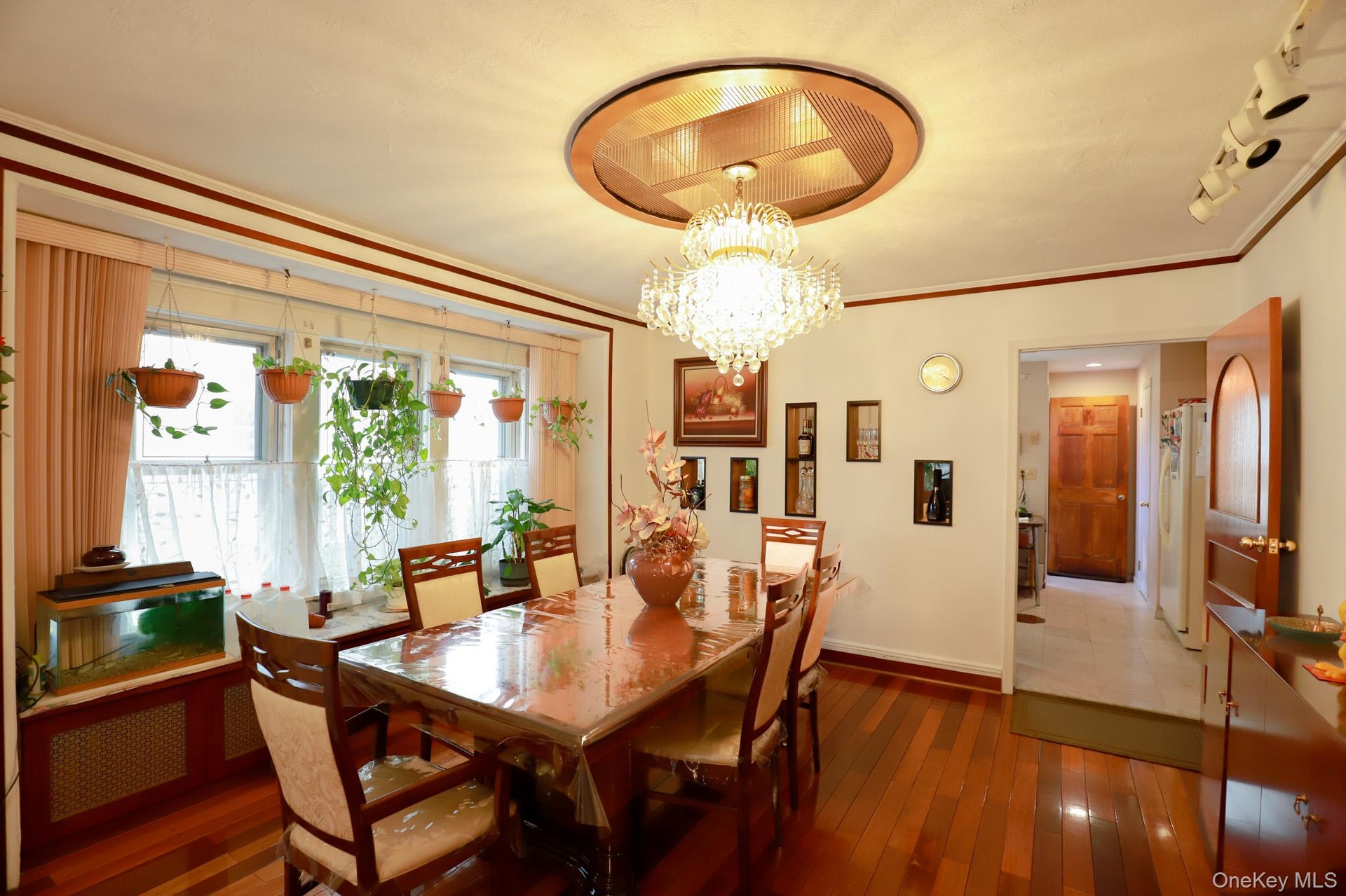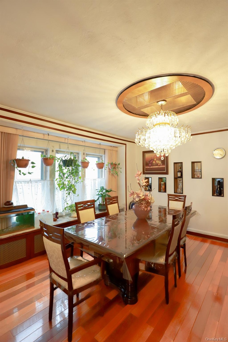 - Dining room with crown molding, dark wood-style flooring, and a chandelier