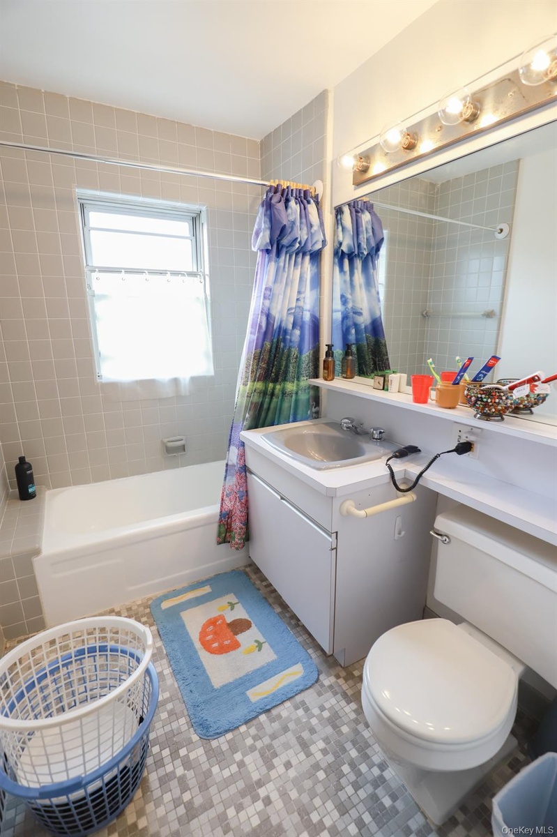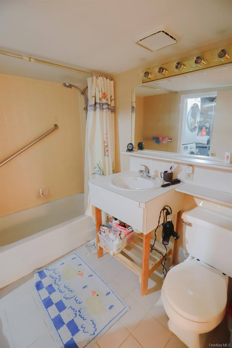 - Full bath featuring shower / tub combo, tile patterned flooring, and vanity
