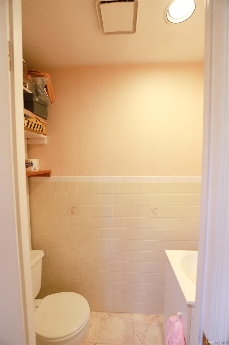 - Half bathroom featuring tile walls, vanity, and a wainscoted wall