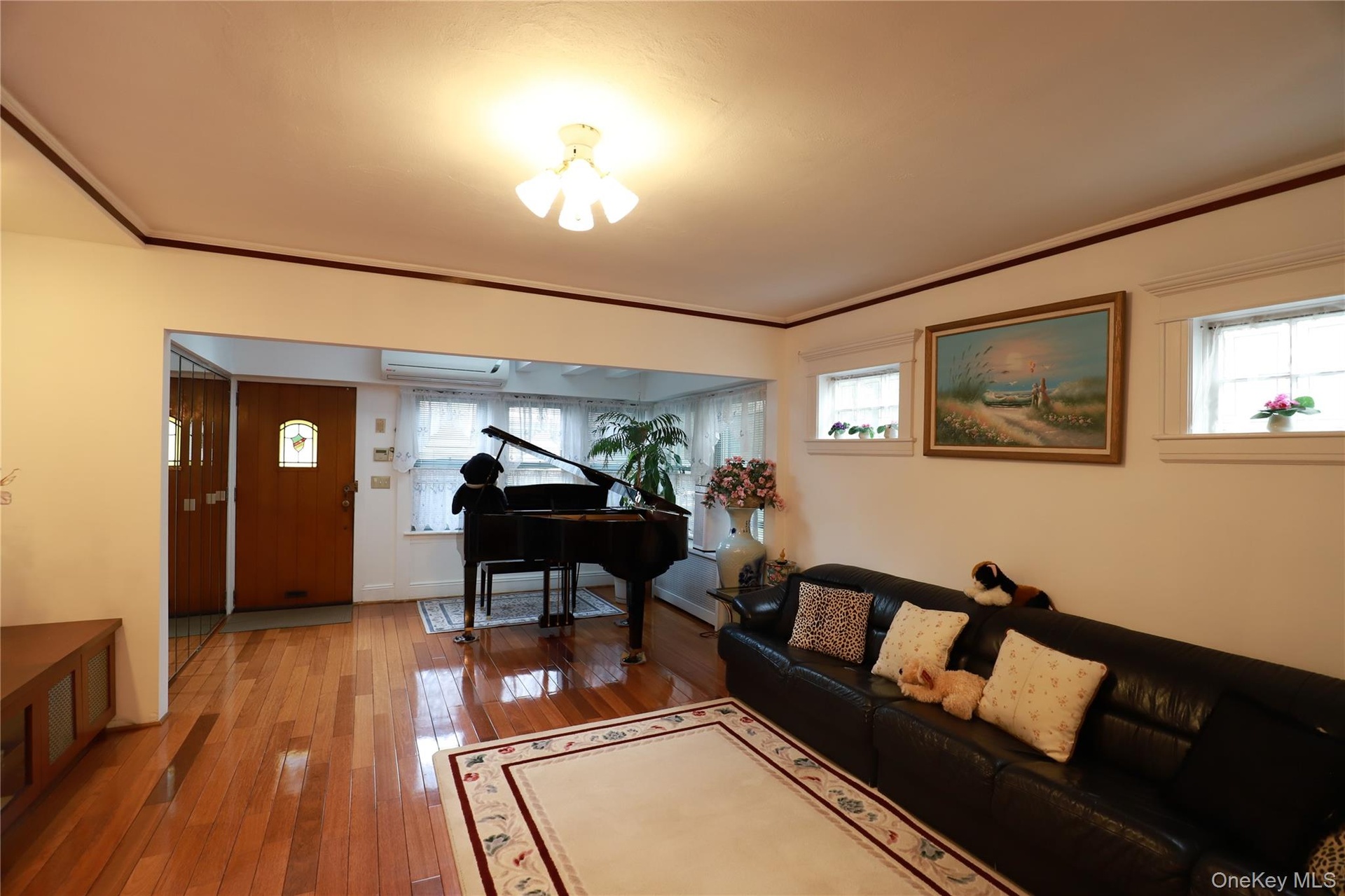 - Living room featuring wood-type flooring, a wall mounted AC, and crown molding