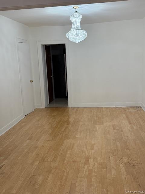 - Empty room with light wood-type flooring and a chandelier