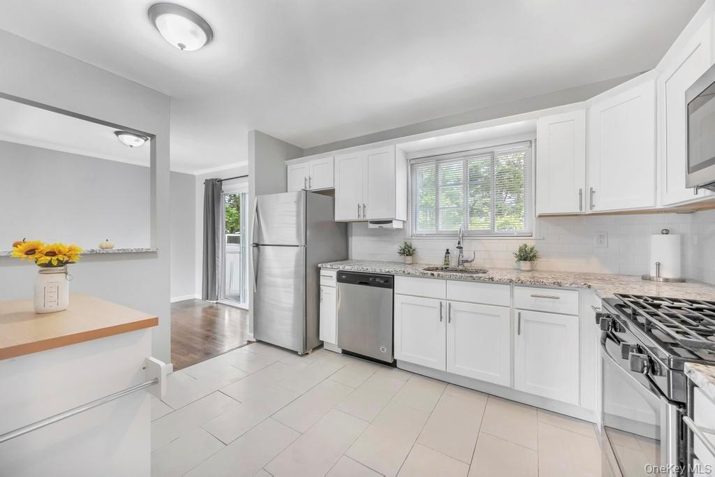 - Kitchen with stainless steel appliances, tasteful backsplash, light stone countertops, and white cabinets