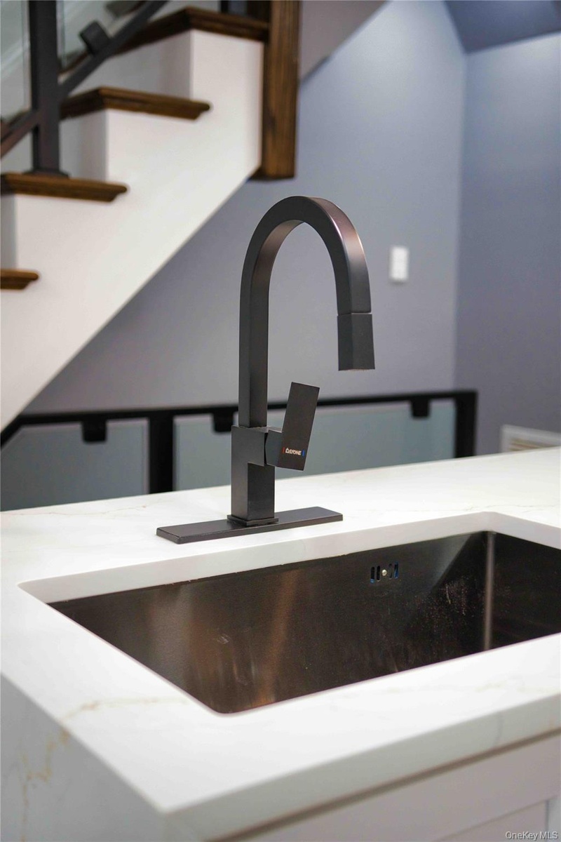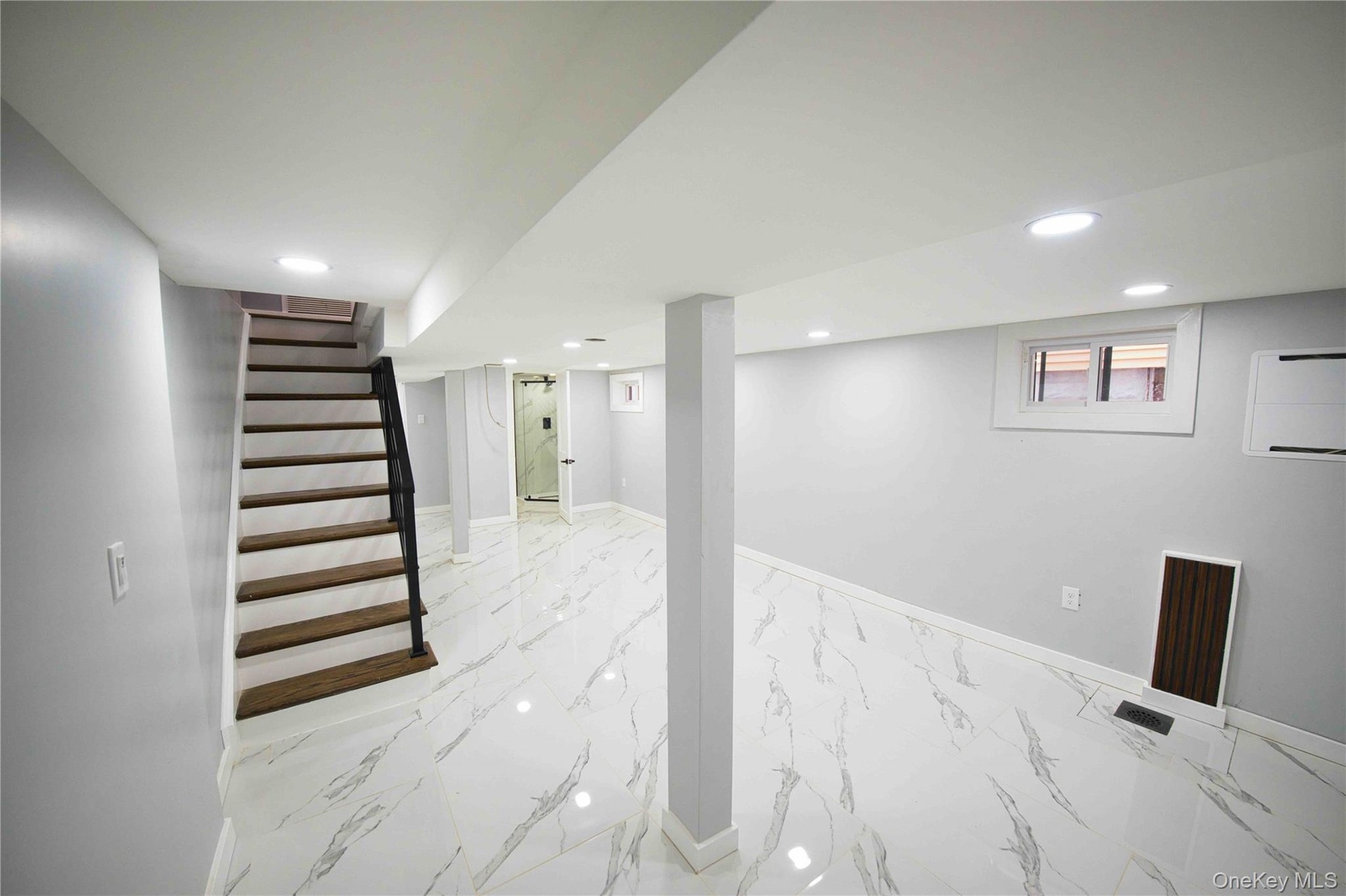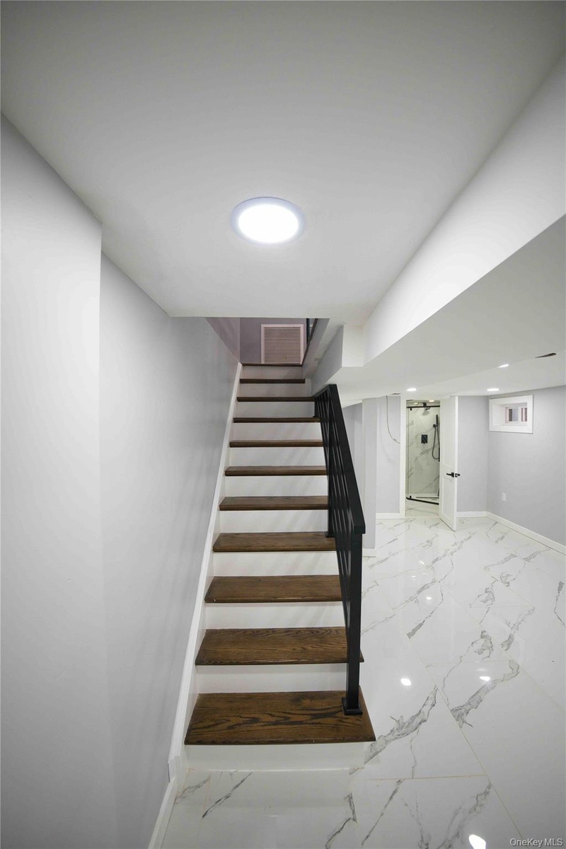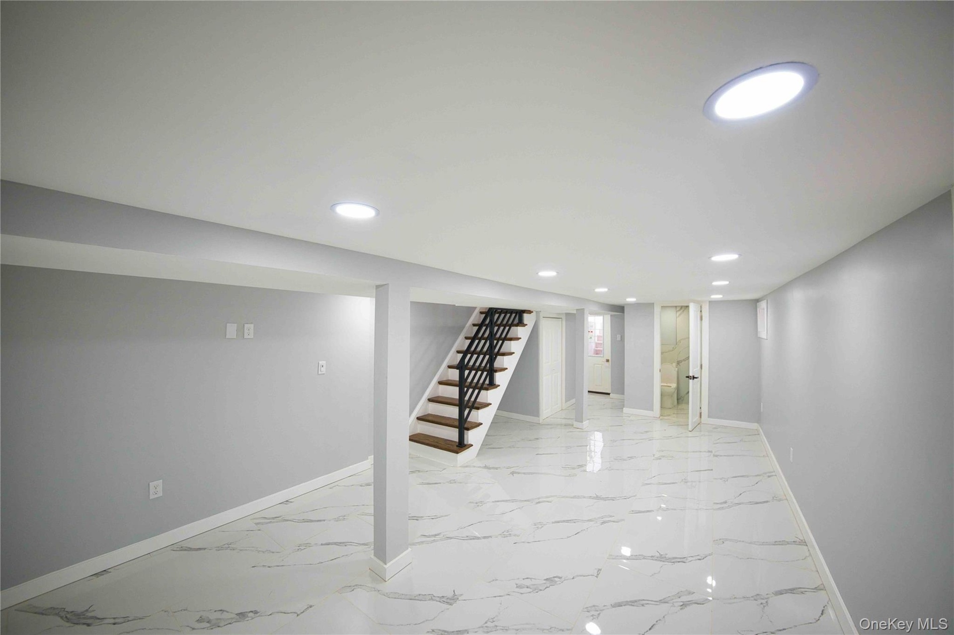 - Basement with recessed lighting, stairway, and light marble finish flooring
