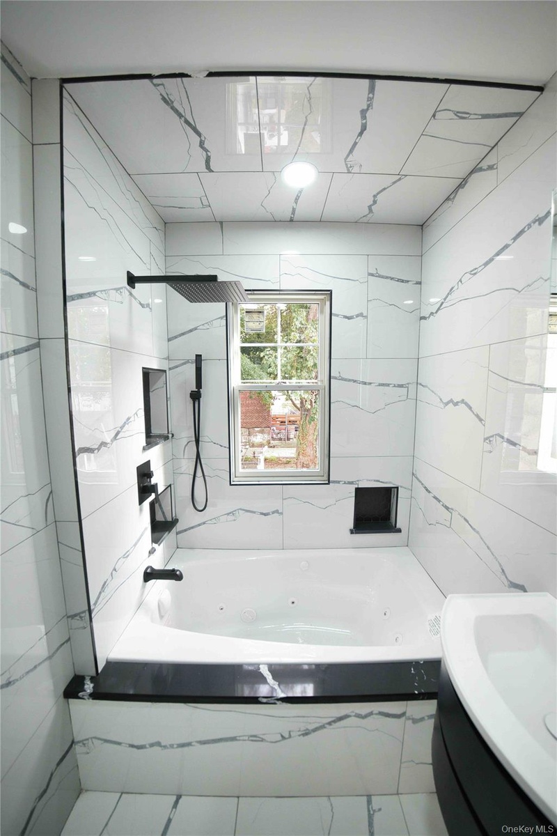 - Bathroom featuring a combined bath / shower with jetted tub and vanity