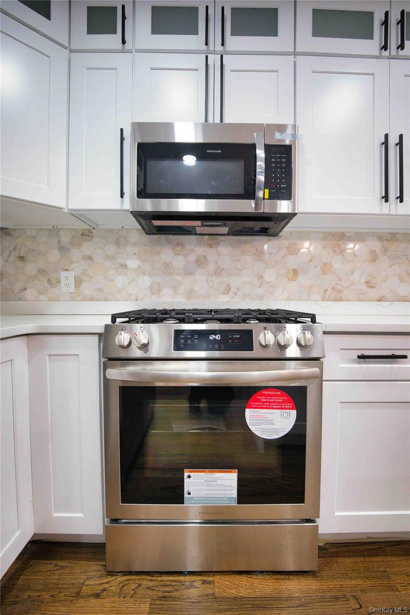 - Kitchen featuring appliances with stainless steel finishes, white cabinetry, backsplash, and light stone countertops